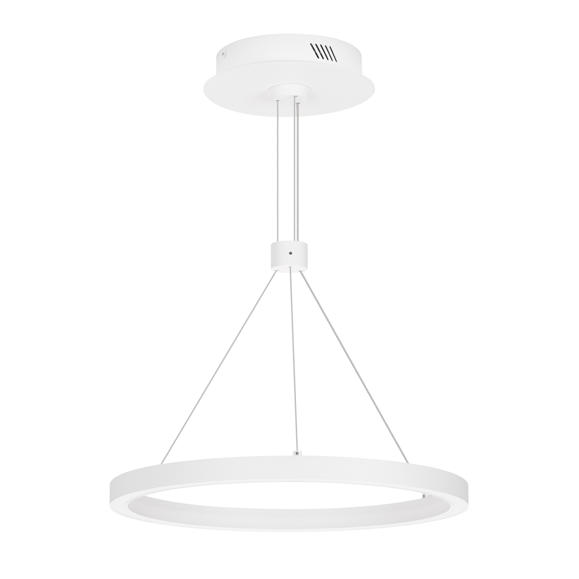 Подвесной светильник. Мощность 24 Вт, св. поток 1340 лм, 56 лм/Вт, тёплый 3000 K, CRI>90, угол 120°, напряжение питания 230 В. Белый круглый корпус из алюминия, экран силикон, степень защиты IP20. Размер: диаметр 400 мм, высота 25 мм, ширина профиля 25 мм, размер чаши: диаметр 170 мм, высота 40 мм. Монтаж подвесной, длина подвеса 1200мм. Драйвер 33-40 В, 600 мА Пульсация <5%.