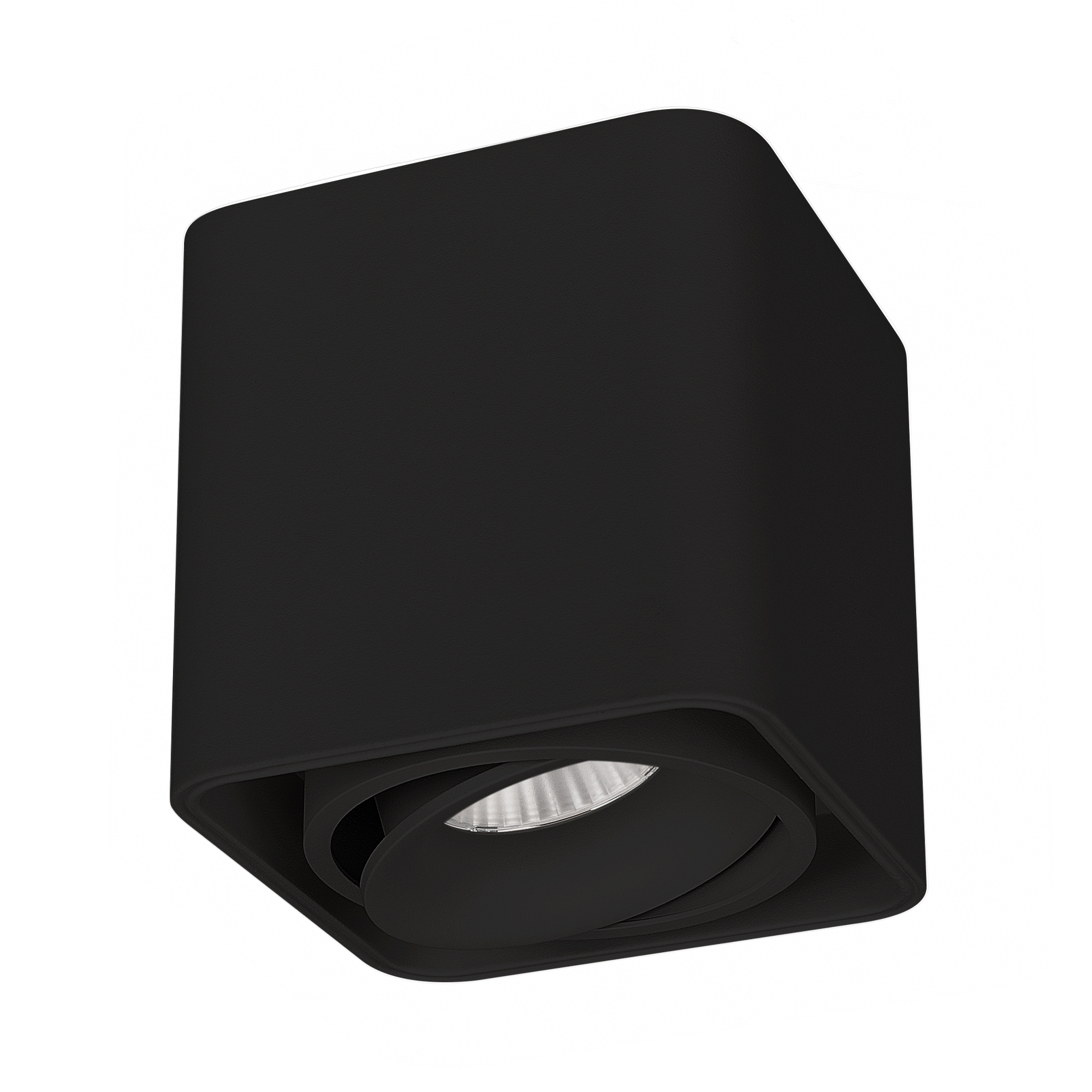 Накладной интерьерный светильник. Мощность 8 Вт, св. поток 760 лм, 98 лм/Вт, теплый 3000 K, CRI>90, угол 45°, регулируемое направление луча 30°, напряжение питания 230 В. Черный квадратный корпус из алюминия, степень защиты IP20. Размер: длина 100 мм, ширина 100 мм, высота 100 мм. Монтаж накладной. Драйвер 24-42 В, 200 мА, пульсация <1%.