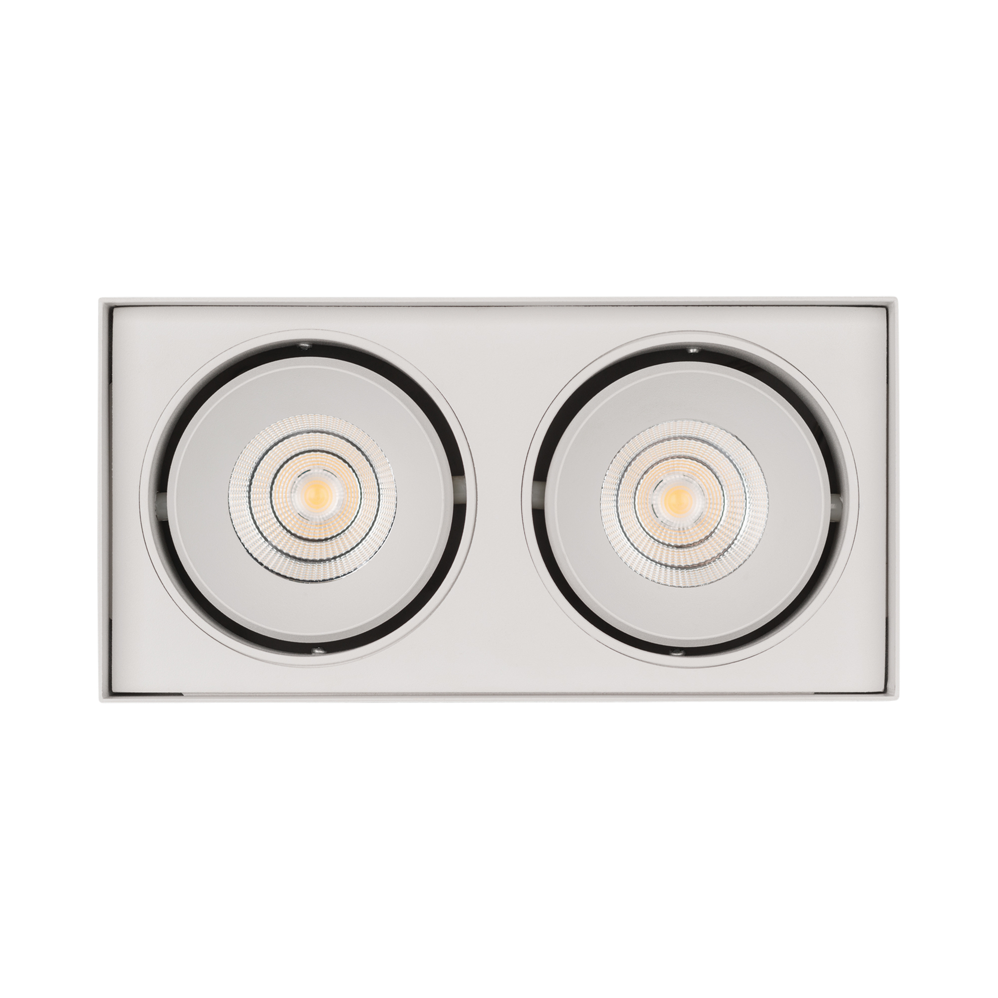 Накладной интерьерный светильник. Мощность 2x11 Вт, св. поток 1660 лм, 75 лм/Вт, теплый 3000 K, CRI>90, угол 40°, регулируемое направление луча 30°, напряжение питания 230 В. Белый квадратный корпус из алюминия, степень защиты IP20. Размер: длина 100 мм, ширина 200 мм, высота 135 мм. Монтаж накладной. Драйвер 18-24 В, 500 мА (2 штуки), пульсация <5%.
