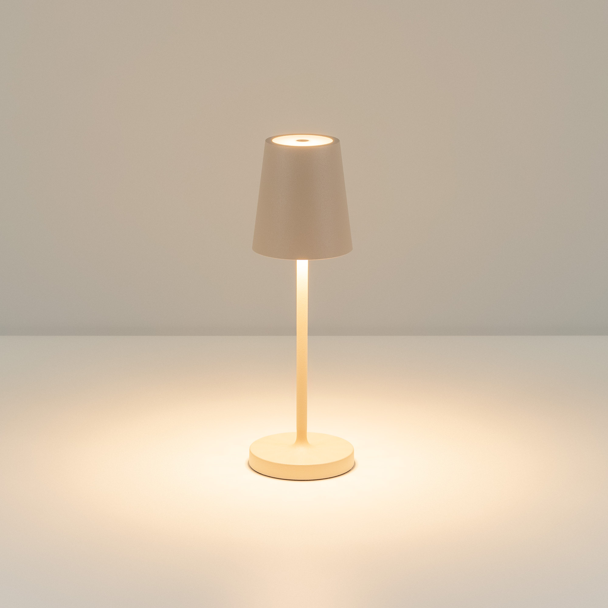 Настольный светильник со встроенным аккумулятором 1.5Вт, алюминиевый корпус, цвет песочный. Цвет ТЕПЛЫЙ БЕЛЫЙ 2200-2700-3000K, св.поток 110-130 лм, CRI(Ra)>80, угол 90°. Размер Ф75x250мм. IP54. Зарядка от сети переменного тока AC220-240V. Тип встроенного аккумулятора 1500мАч Li-ion, напряжение батареи 3.7V
