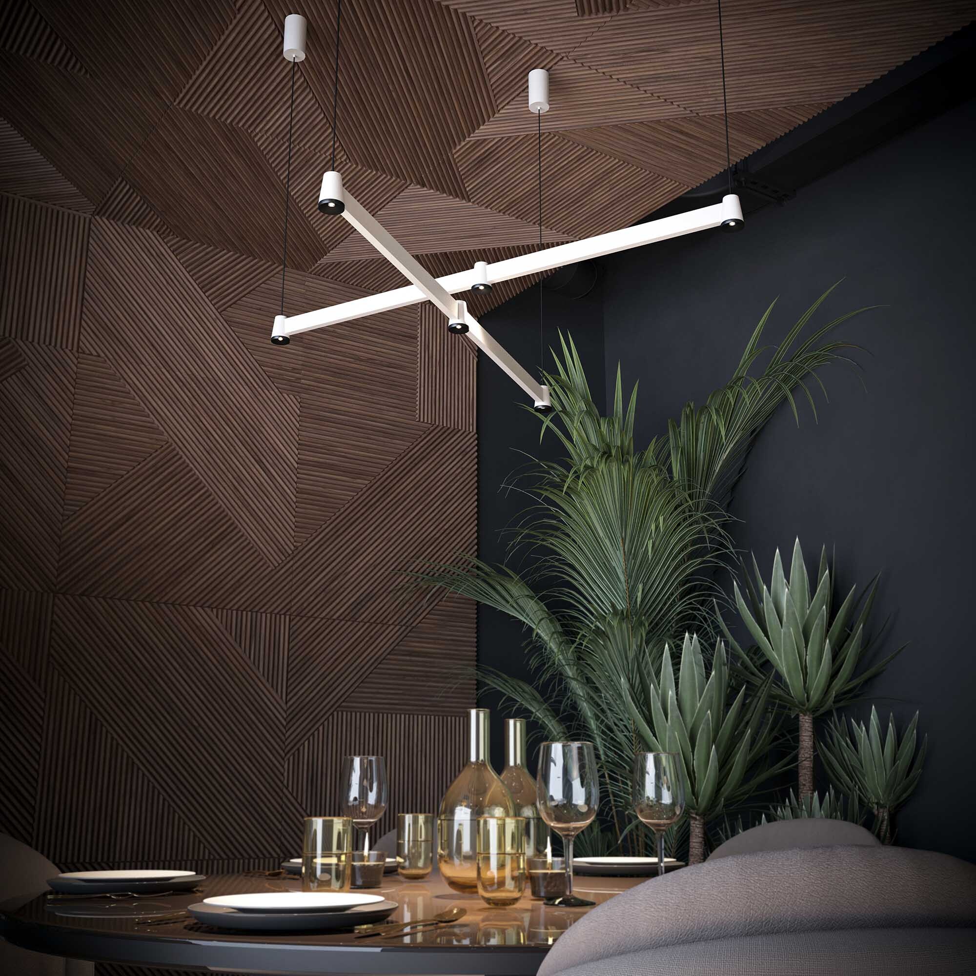 Подвесной светильник. Мощность 16 Вт, св. поток 1010 лм, 63 лм/Вт, теплый 3000 K, CRI>90, угол 35°, напряжение питания 230 В. Белый корпус из алюминия, степень защиты IP20. Размер: длина 1039 мм, ширина 40 мм, высота 55 мм, размер чаши: диаметр 50 мм, высота 90 мм. Монтаж подвесной, длина подвеса 1300 мм. Драйвер 27-38 В, 500 мА, пульсация <1%.