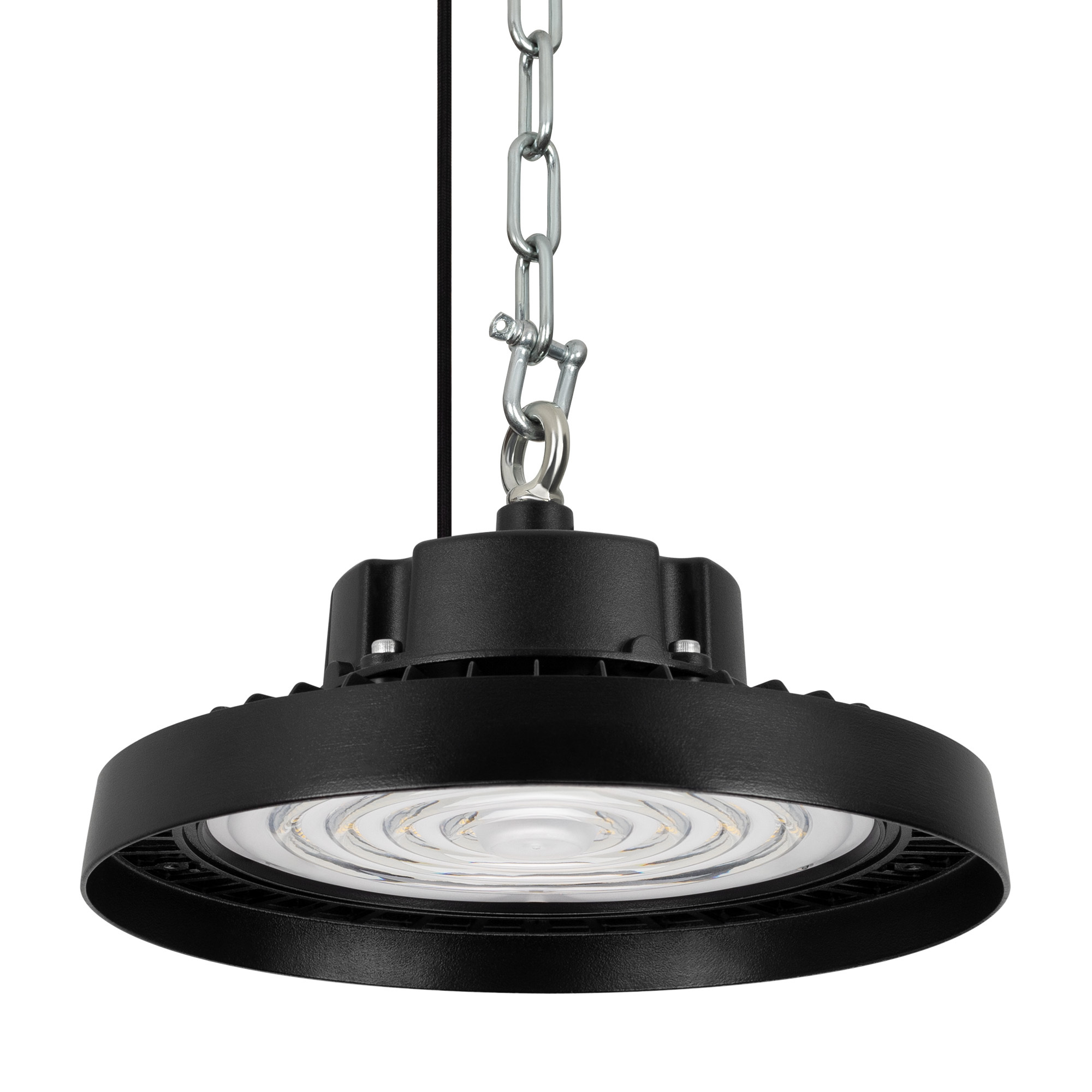 Светильник для освещения складских и промышленных помещений. Мощность 150 Вт, напряжение питания AC 220-240V, CRI>80. Тип светодиодов Philips led. Цвет свечения дневной 5000K, световой поток 22500 лм, световая эффективность 150 лм/Вт, угол рассеивания 90°. Коэффициент пульсации 0,5%. Цвет корпуса черный, линза из поликарбоната, степень влагозащиты IP65. Ударопрочность IK08. Габариты Ø255 x 162 мм, длина кабеля 900 мм. Рым-болт в комплекте.