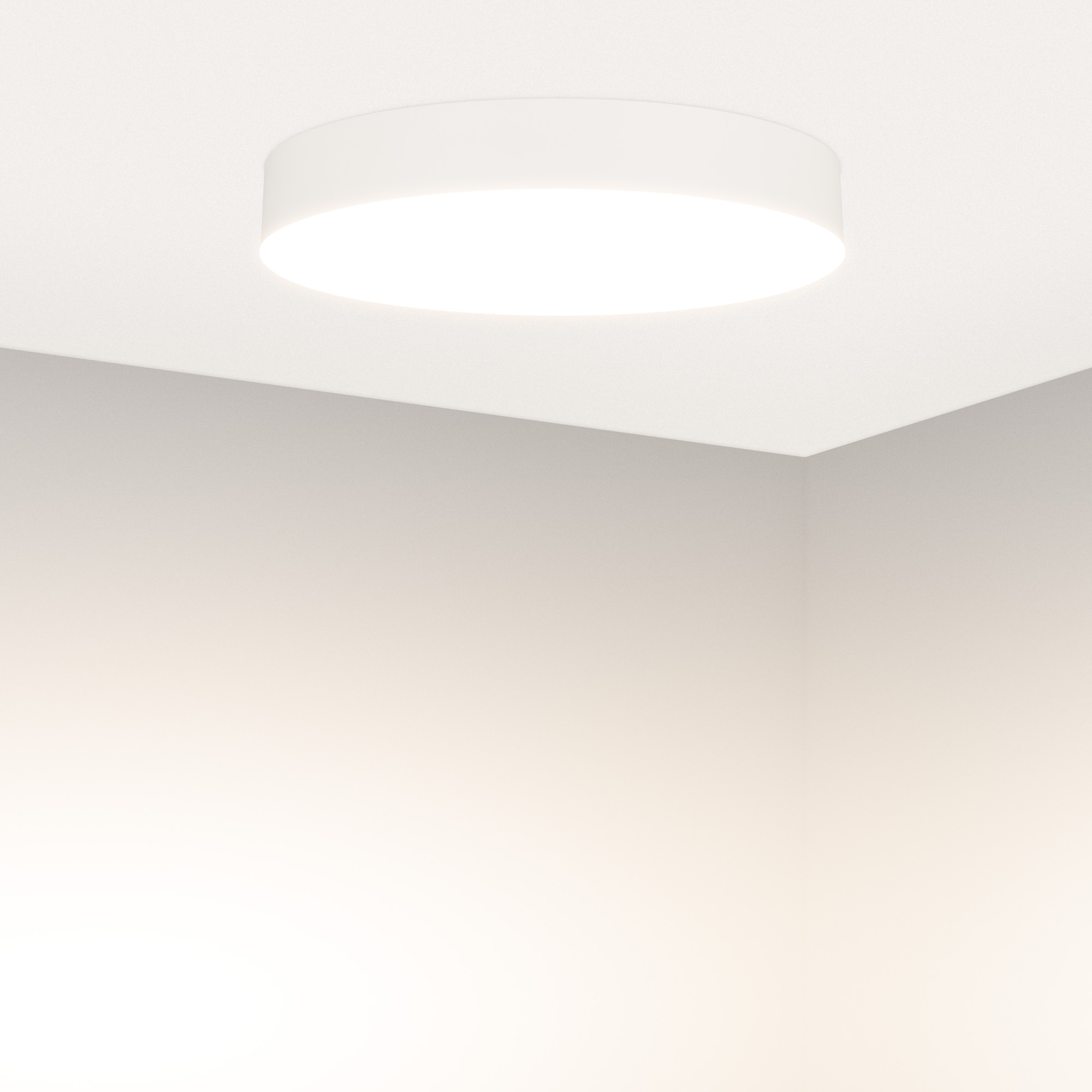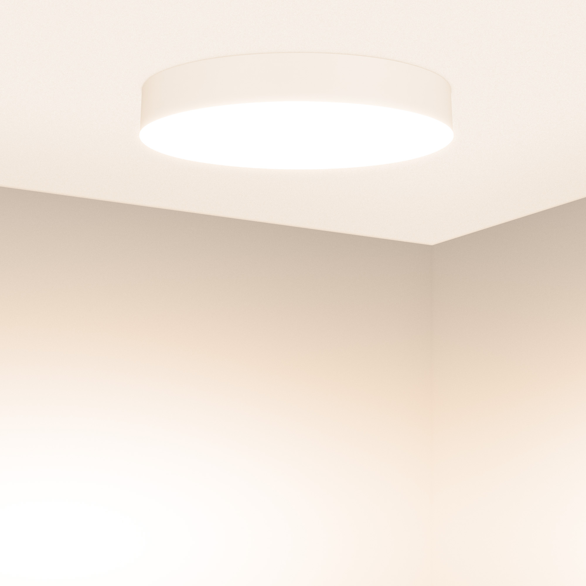 Светодиодный светильник с микроволновым датчиком движения, с изменяемой мощностью и цветовой температурой. Мощность полная 22-32 Вт (переключается), св. поток 2530-3570 лм, 110 лм/Вт, теплый 3000 K, дневной 4000K, белый 5700K (переключается), CRI>80, угол 110°, напряжение питания 230 В. Белый круглый корпус из пластика, экран PC, степень защиты IP54. Размер: длина 410 мм, ширина 410 мм, высота 76 мм. Монтаж накладной. Драйвер 75-130 В, 185/275 мА, пульсация <5%.