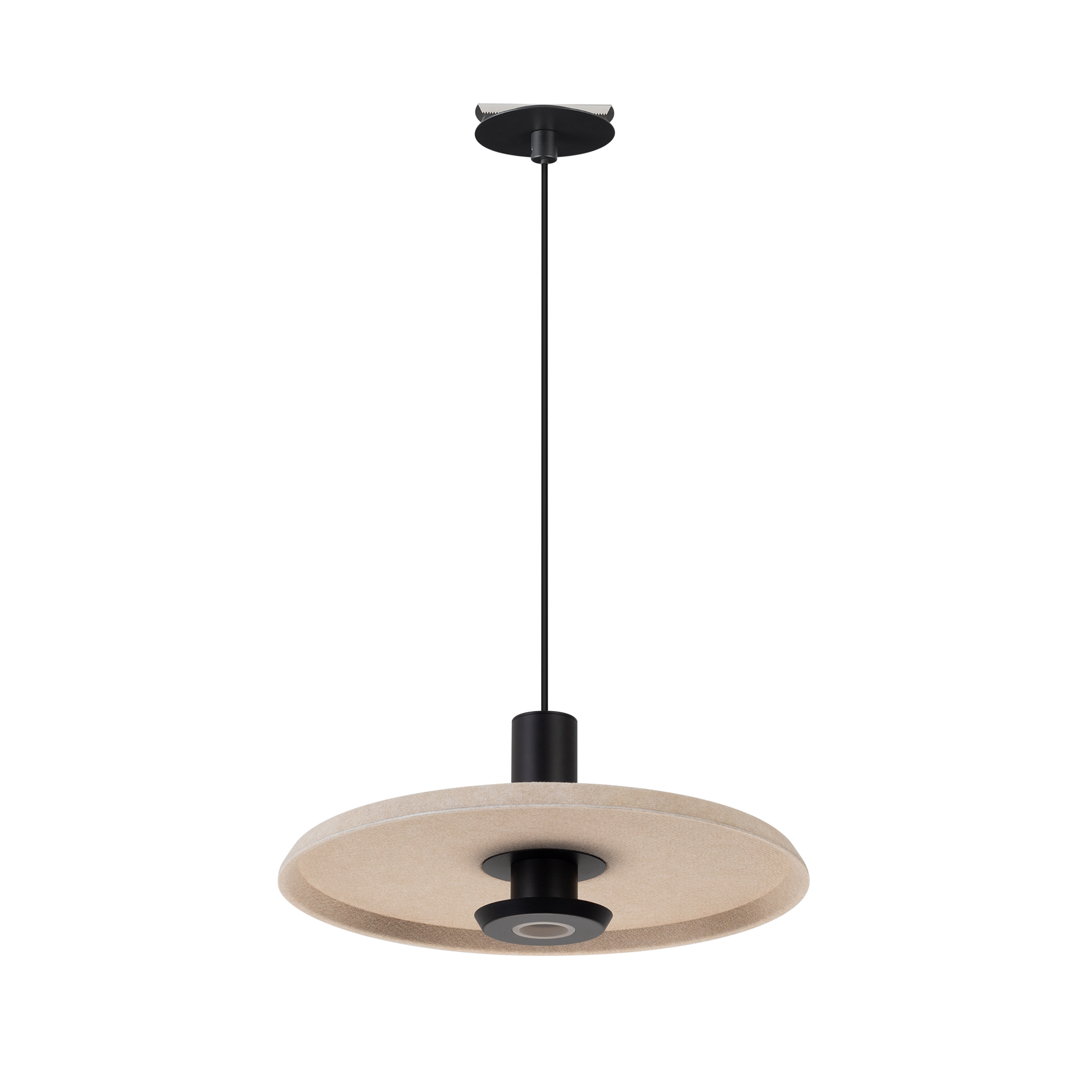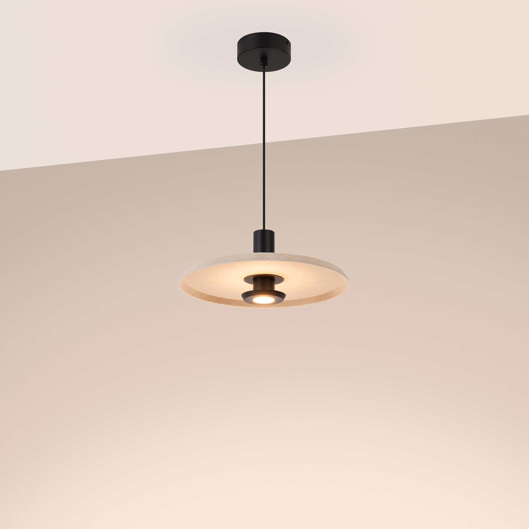 Подвесной светильник. Мощность 12 Вт, св. поток 597 лм, 49 лм/Вт, теплый 2700 K, CRI>94, угол 36°, напряжение питания 230 В. Бежевый фигурный корпус из переработанного фетра с бежевой внутренней поверхностью, линза-рассеиватель из PMMA, степень защиты IP20. Размер: диаметр 350 мм, высота 145 мм. Монтаж подвесной, длина подвеса 2000 мм, регулируемая. В комплекте 2 вида чаш. Габариты чаши (встраиваемая) Ø80 х 23 мм, врезное отверстие Ø60 мм. Габариты чаши (накладная) Ø120 x 35 мм. Драйвер 59 В, 300 мА, пульсация <1%. Управление по TRIAC.