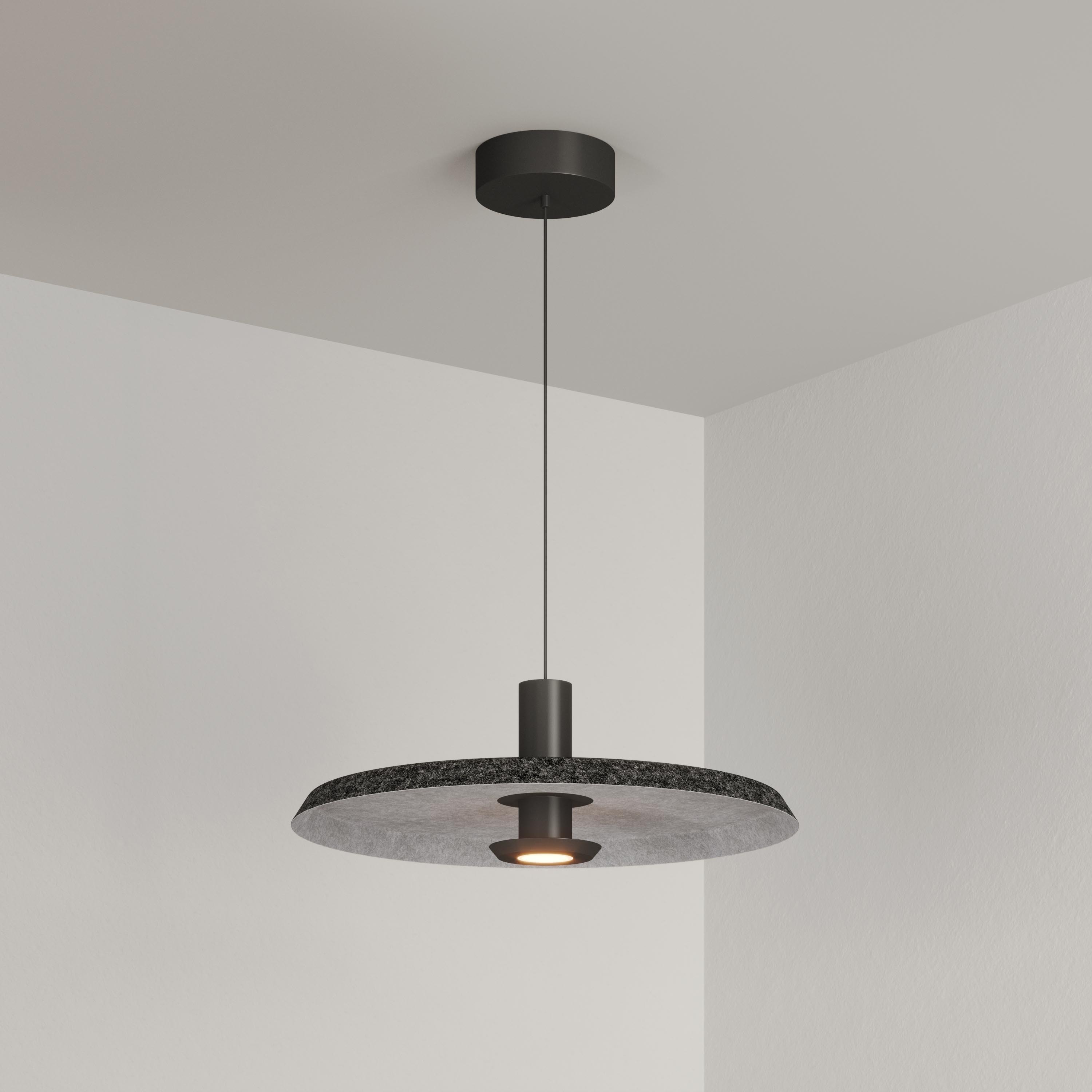 Подвесной светильник. Мощность 12 Вт, св. поток 768 лм, 64 лм/Вт, теплый 3000 K, CRI>94, угол 36°, напряжение питания 230 В. Темно-серый фигурный плафон из переработанного фетра со светло-серой внутренней поверхностью, линза-рассеиватель из PMMA, степень защиты IP20. Размер: диаметр 450 мм, высота 145 мм. Монтаж подвесной, длина подвеса 2000 мм, регулируемая. В комплекте 2 вида чаш. Габариты чаши (встраиваемая) Ø80 х 23 мм, врезное отверстие Ø60 мм. Габариты чаши (накладная) Ø120 x 35 мм. Драйвер 59В, 300 мА, пульсация <1%. Управление по TRIAC.