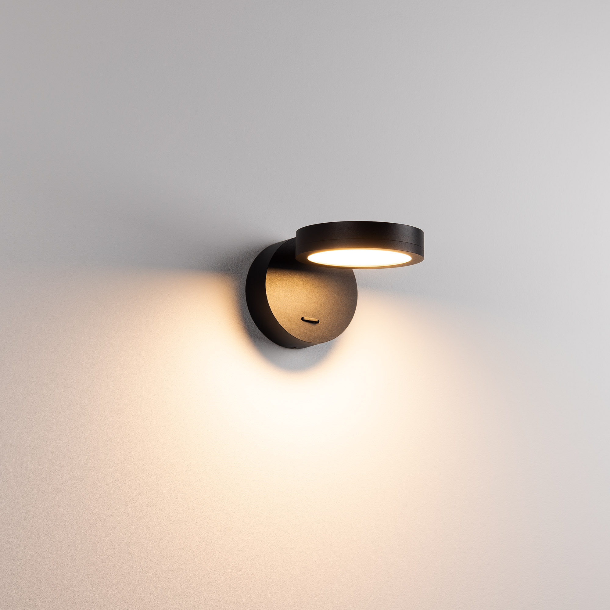 Накладной поворотный настенный светильник. Мощность 6 Вт, св. поток 360 лм, 60 лм/Вт, теплый 3000 K, CRI>90, угол 110°, напряжение питания 230 В. Черный круглый корпус из алюминия, степень защиты IP20. Размер основания Ø90 x 32 мм. Размер светоизлучателя Ø100 x 21 мм, угол поворота вокруг своей оси 350°. Монтаж накладной. Драйвер встроенный, 5 - 18В., 350мА, пульсация <1%.
