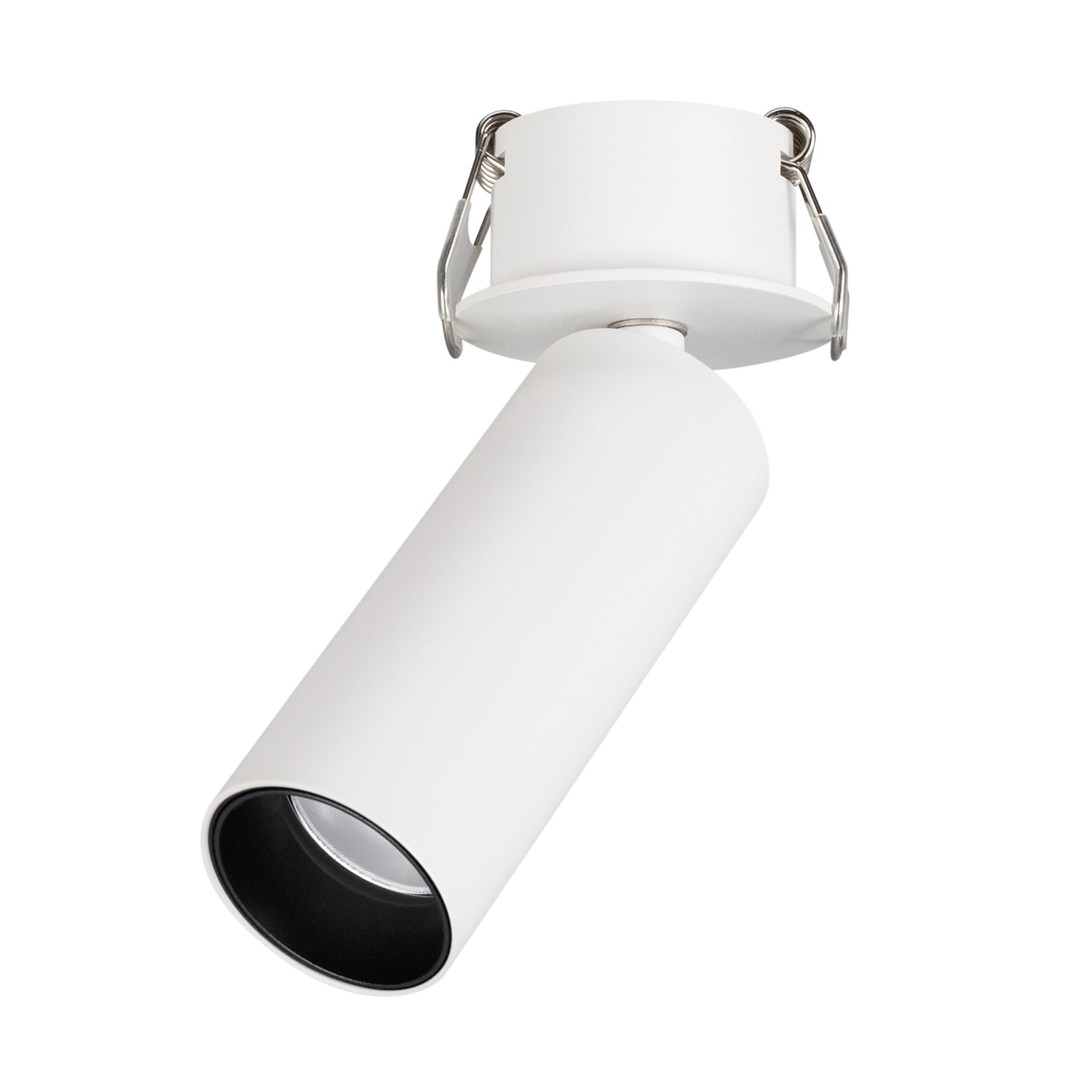 Светильник встраиваемый откидной. Мощность 7 Вт, св. поток 490 лм, 70лм/Вт, теплый 3000 K, CRI>90, угол 36°, напряжение питания 230 В. Белый круглый корпус из алюминия, экран PMMA, степень защиты IP40. Размер: диаметр 35 мм, высота светового модуля 90 мм, высота основания 1.5 мм. Угол поворота 350°, угол наклона 90°. Монтаж встраиваемый, установочное отверстие: диаметр 45 мм, глубина 29 мм. Драйвер в комплекте 30-40 В, 150 мA, пульсация <1%.