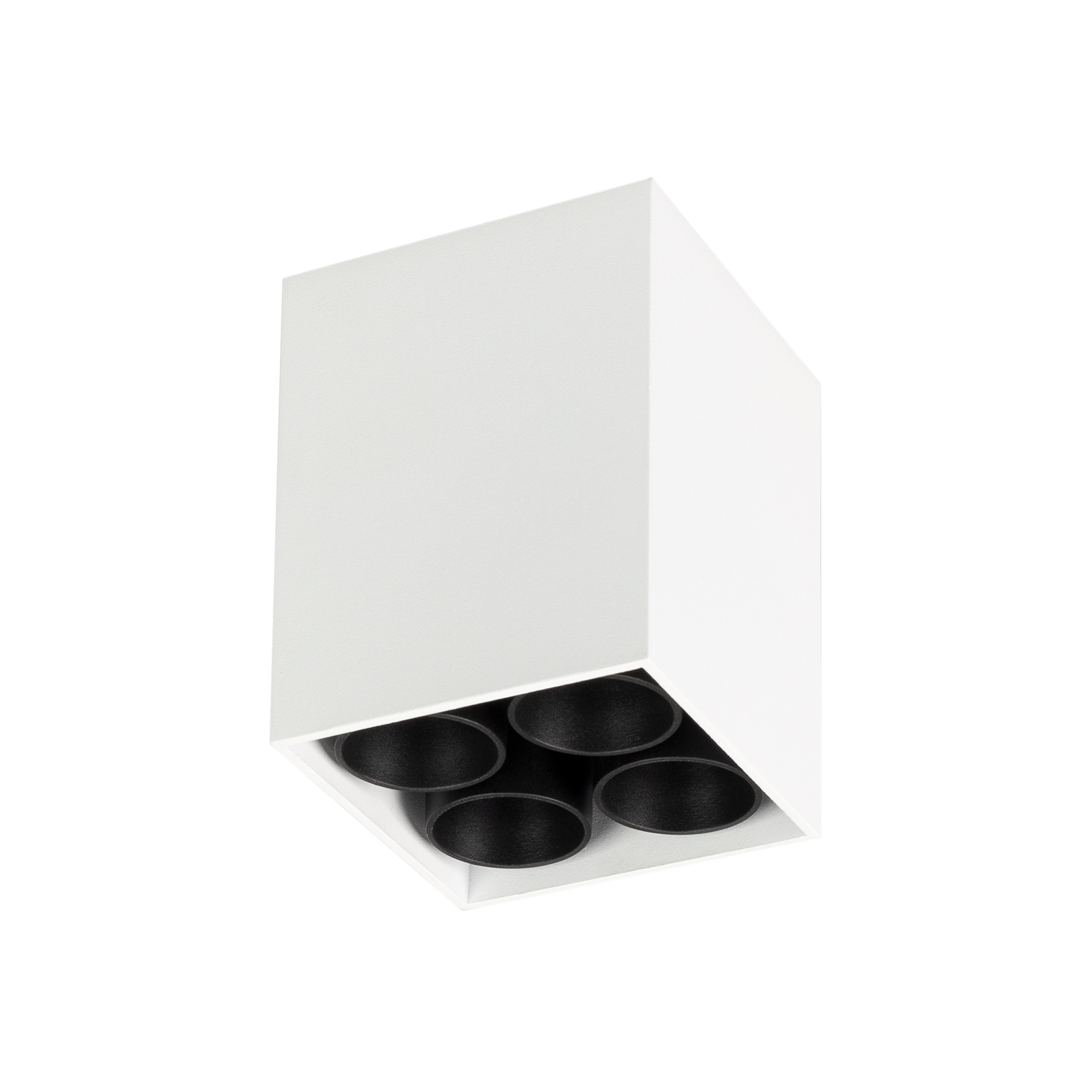 Накладной интерьерный светильник. Мощность 10 Вт, св. поток 634 лм, 64 лм/Вт, дневной 4000 K, CRI>98, угол 30°, напряжение питания 230 В. Белый квадратный корпус из алюминия, степень защиты IP20. Размер: длина 65 мм, ширина 65 мм, высота 85 мм. Монтаж накладной. Драйвер 12.9 В, 700 мА, пульсация <5%.