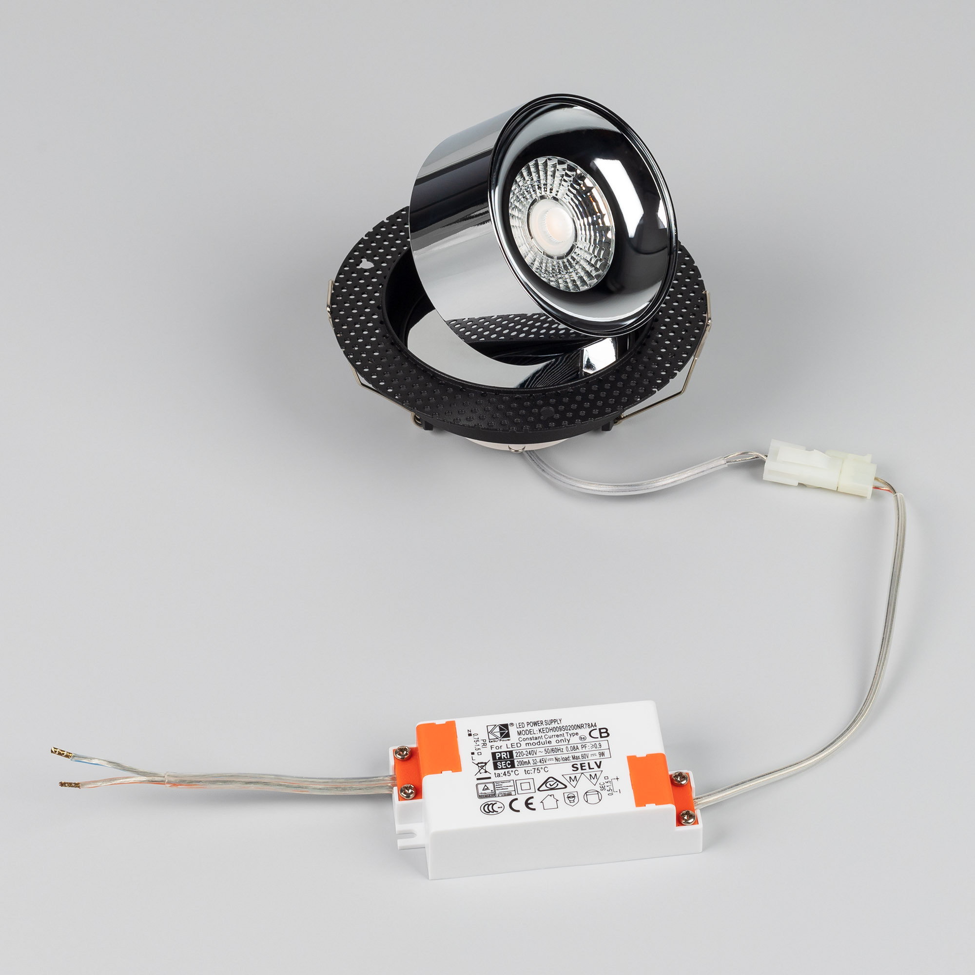 Светильник встраиваемый поворотный безрамочный. Мощность 9 Вт, св. поток 580 лм, 64 лм/Вт, дневной 4000 K, CRI>90, угол 36°, напряжение питания 230 В. Модуль цвета хром, черный круглый корпус из алюминия, степень защиты IP20. Размер: диаметр 120 мм, высота 41 мм. Монтаж встраиваемый, установочное отверстие: диаметр 91 мм. Размер светодиодного модуля: диаметр 77 мм, высота 59 мм. Драйвер 38 В, 200 мА, пульсация <1%.