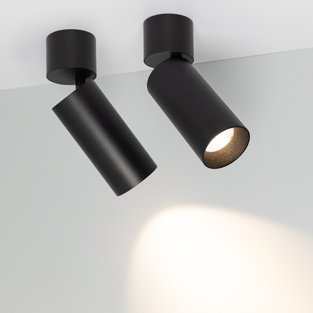 Накладной светильник 8Вт, черный круглый корпус, черная вставка, металл. Цвет свечения БЕЛЫЙ ТЕПЛЫЙ 3000K, св.поток 570лм, CRI(Ra)>80, угол 40°. Световой модуль способен поворачиваться вокруг своей оси на 350° и 90° по вертикали. Размер DxH Ø65x200мм, встроенный драйвер PRI:220-240VAC, SEC:DC 200mA 30-43V 8Вт.