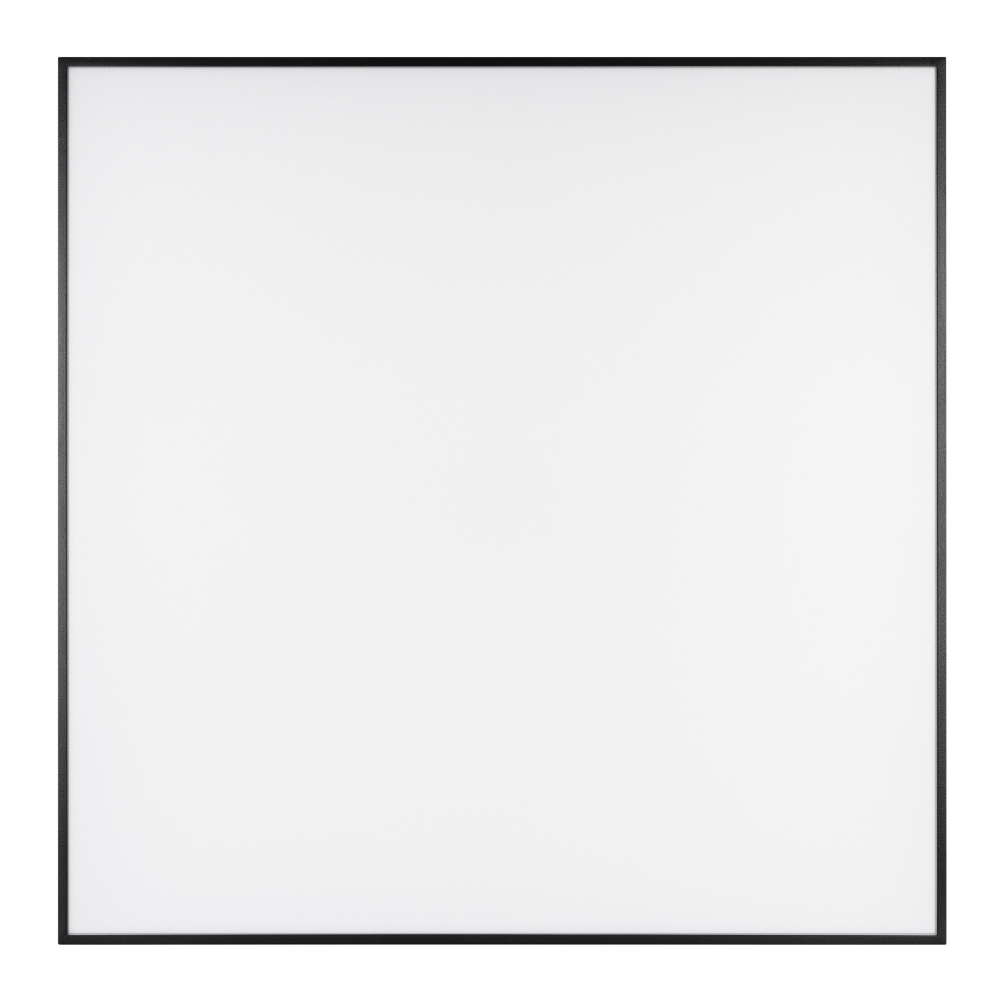 Накладной светильник. Мощность 60 Вт, св. поток 4900-5500 лм, 80-90 лм/Вт, дневной 4000 K, CRI>90, угол 120°, напряжение питания 230 В. Черный квадратный корпус из алюминия, экран PC, степень защиты IP40. Размер: длина 600 мм, ширина 600 мм, высота 64 мм. Монтаж накладной. Драйвер 27-40 В, 1400 мА, пульсация <5%.