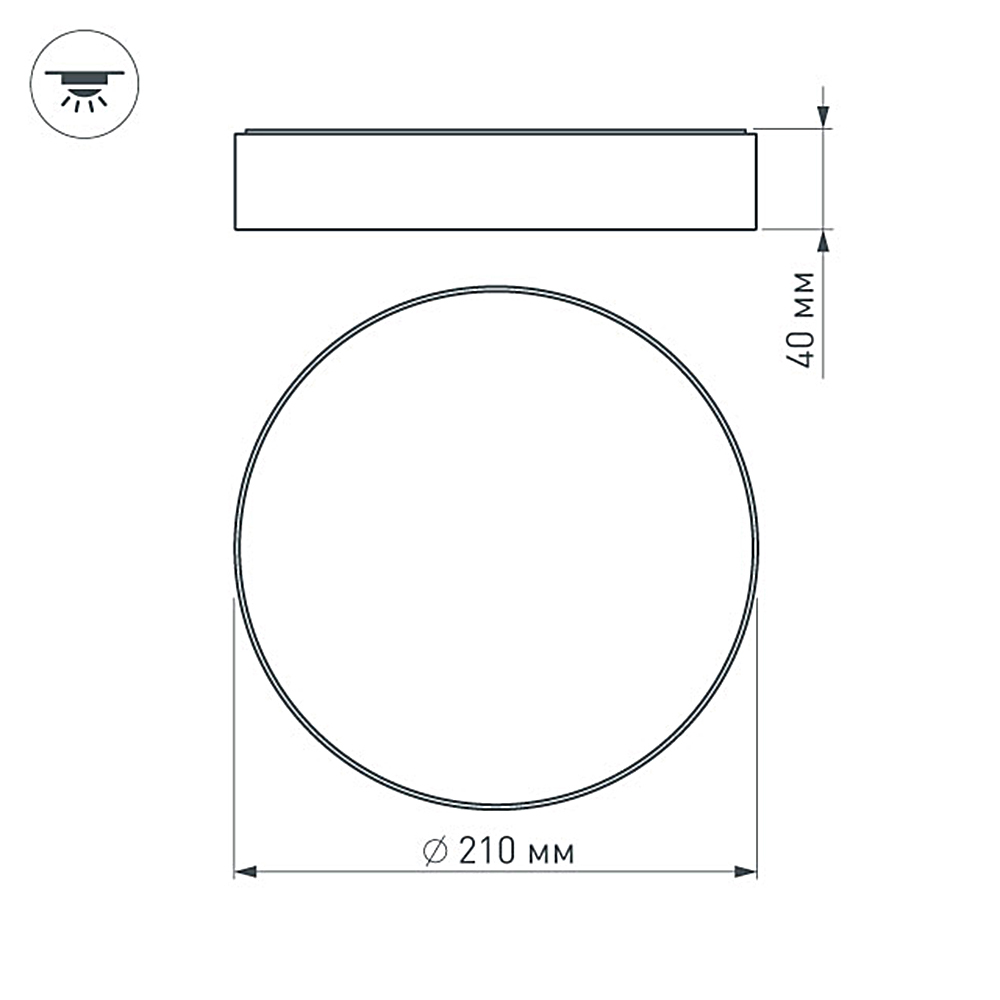 Накладной светильник. Мощность 20 Вт, св. поток 1400-1600 лм, 80-90 лм/Вт, теплый 3000 K, CRI>90, угол 120°, напряжение питания 230 В. Черный круглый корпус из алюминия, экран PC, степень защиты IP40. Размер: диаметр 210 мм, высота 52 мм. Монтаж накладной. Драйвер 27-42 В, 500 мА, пульсация <5%.