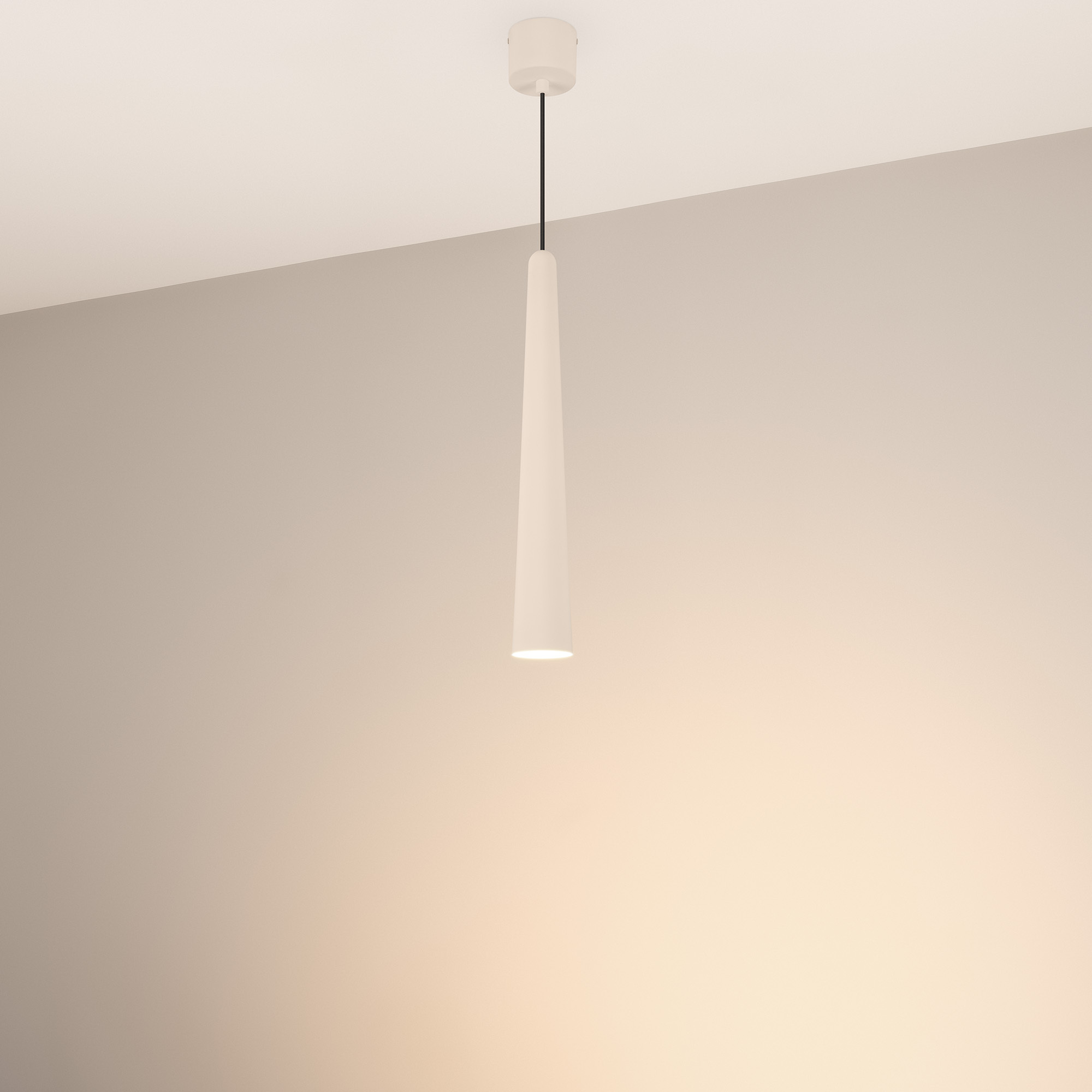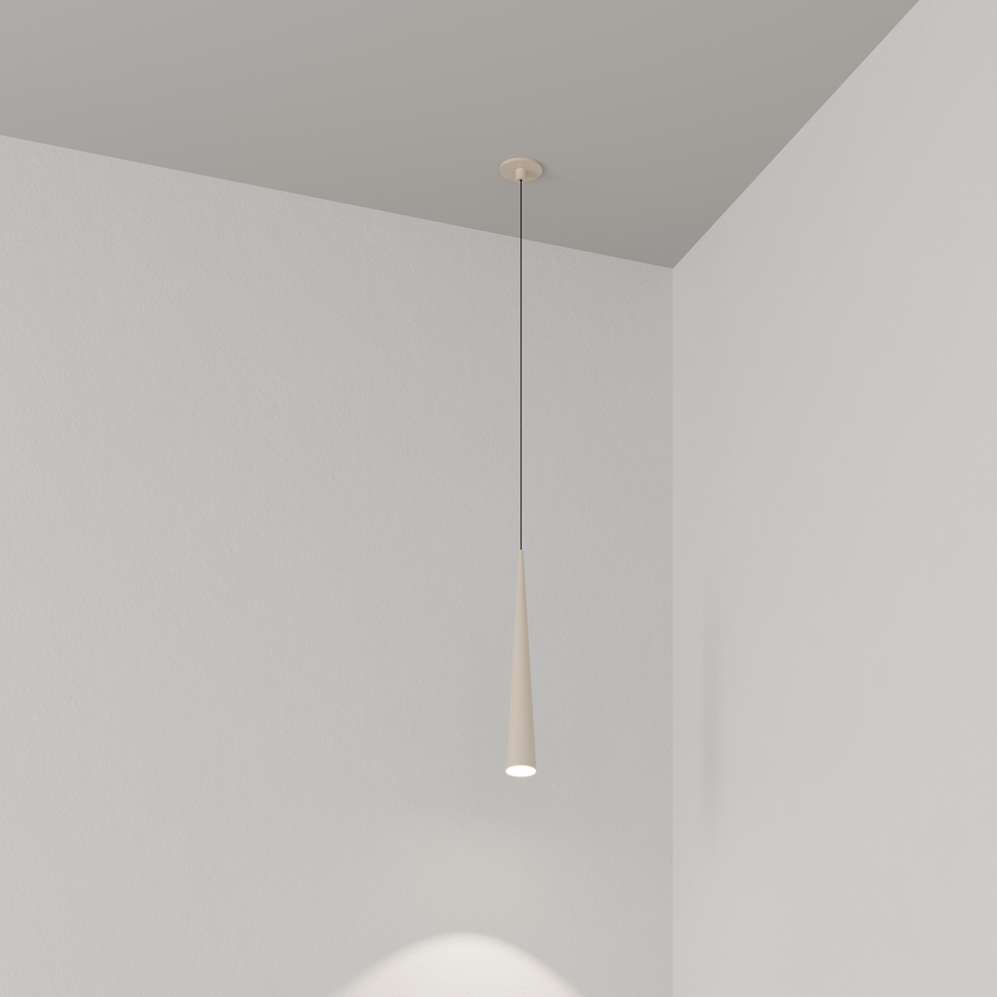 Подвесной светильник. Мощность 5 Вт, св. поток 400 лм, световая эффективность 70 лм/Вт, теплый 3000K, CRI>92, угол 36°, напряжение питания 230 В. Кремовый конусообразный вытянутый корпус из алюминия, линза из PMMA, степень защиты IP20. Размер: диаметр 57 мм, высота 400 мм. Монтаж подвесной, длина подвеса 2000 мм, регулируемая. В комплекте 2 вида чаш. Габариты встраиваемой чаши: Ø 80x41 мм. Габариты накладной чаши Ø80x60 мм. Драйвер 2,8-12В, 500 мА, пульсация <1%.