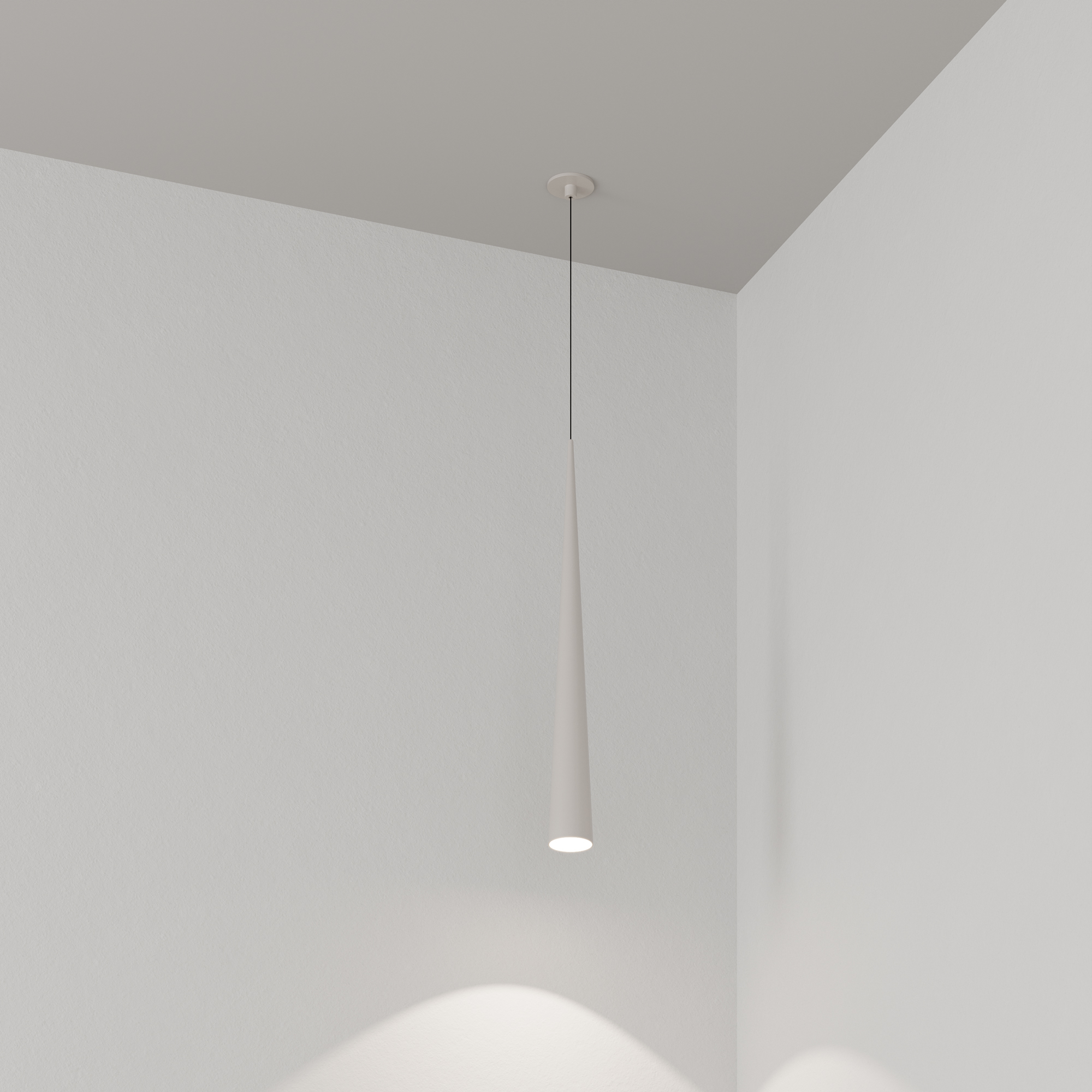 Подвесной светильник. Мощность 5 Вт, св. поток 400 лм, 70 лм/Вт, теплый 2700 K, CRI>92, угол 36°, напряжение питания 230 В. Светло-серый конусообразный вытянутый корпус из алюминия, линза из PMMA, степень защиты IP20. Размер: диаметр 76 мм, высота 670 мм. Монтаж подвесной, длина подвеса 2000 мм, регулируемая. В комплекте 2 вида чаш. Габариты встраиваемой чаши: Ø 80x41 мм. Габариты накладной чаши Ø80x60 мм. Драйвер 2,8-12В, 500 мА, пульсация <1%.