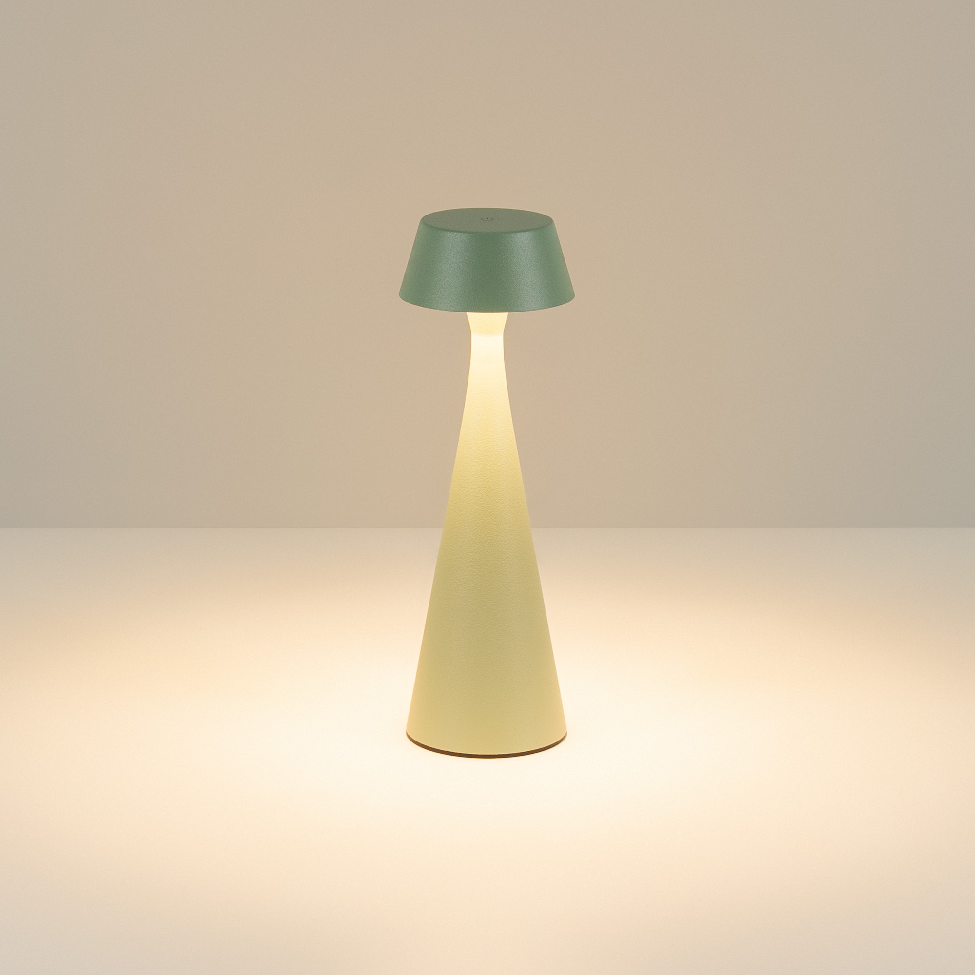 Настольный светильник со встроенным аккумулятором, 2Вт, алюминиевый корпус, цвет зеленый. Цвет ТЕПЛЫЙ БЕЛЫЙ 2200-2700-3000K, св.поток 110-130 лм, CRI(Ra)>80, угол 154°. Размер Ф80x242мм. IP54. Зарядка от сети переменного тока AC220-240V. Тип встроенного аккумулятора 2x2200мАч Li-ion, напряжение батареи 5V