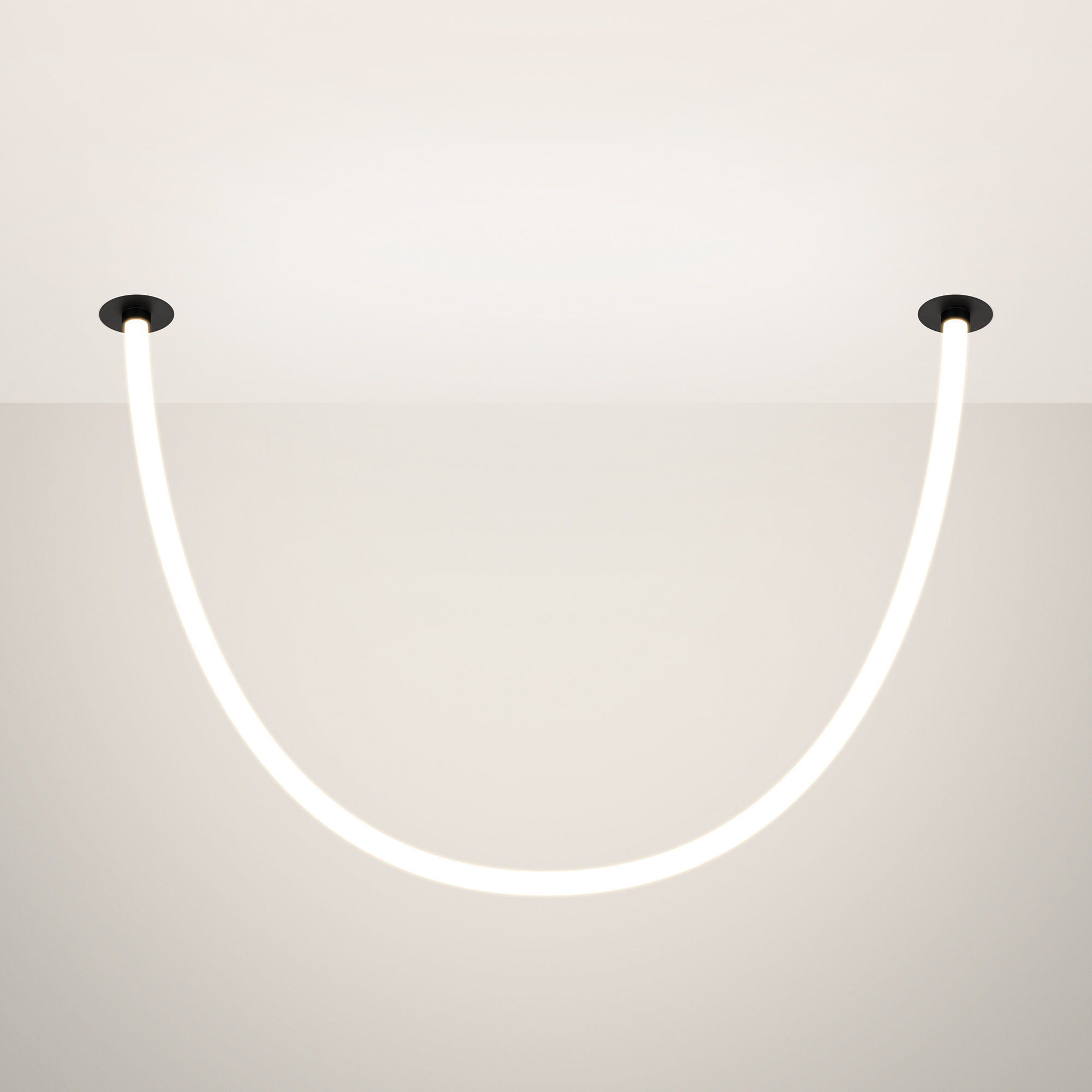 Подвесной светильник. Мощность 18 Вт, св. поток 1160 лм, 64 лм/Вт, дневной 4000 K, CRI>90, угол 360°, напряжение питания 230 В. Черный круглый корпус из стали, силиконовая герметичная лента, степень защиты IP20. Размер: диаметр утапливаемой части чаши 64 мм, высота чаши с утапливаемой частью без вывода под неон 40 мм, общая высота чаши 57 мм, диаметр чаши с фланцем 100 мм, диаметр силиконовой герметичной ленты 18 мм, длина силиконовой герметичной ленты 1200 мм. Монтаж встраиваемый, глубина установки 55 мм, диаметр установочного отверстия 70 мм. Блок питания 24 В, 750 мА, пульсация <5%.