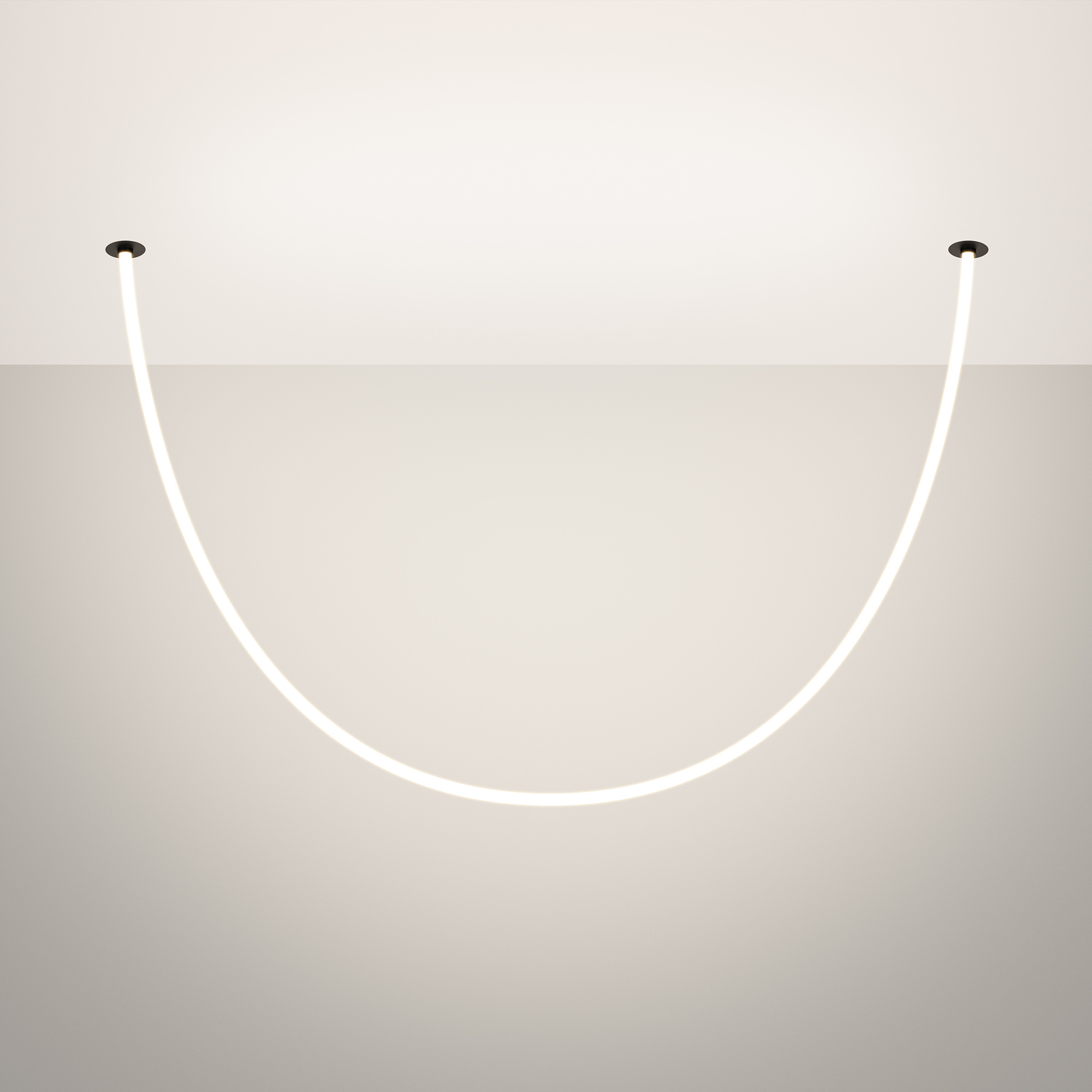 Подвесной светильник. Мощность 36 Вт, св. поток 2300 лм, 63 лм/Вт, дневной 4000 K, CRI>90, угол 360°, напряжение питания 230 В. Черный круглый корпус из стали, силиконовая герметичная лента, степень защиты IP20. Размер: диаметр утапливаемой части чаши 64 мм, высота чаши с утапливаемой частью без вывода под неон 40 мм, общая высота чаши 57 мм, диаметр чаши с фланцем 100 мм, диаметр силиконовой герметичной ленты 18 мм, длина силиконовой герметичной ленты 2500 мм. Монтаж встраиваемый, глубина установки 55 мм, диаметр установочного отверстия 70 мм. Блок питания 24 В, 1880 мА, пульсация <5%.