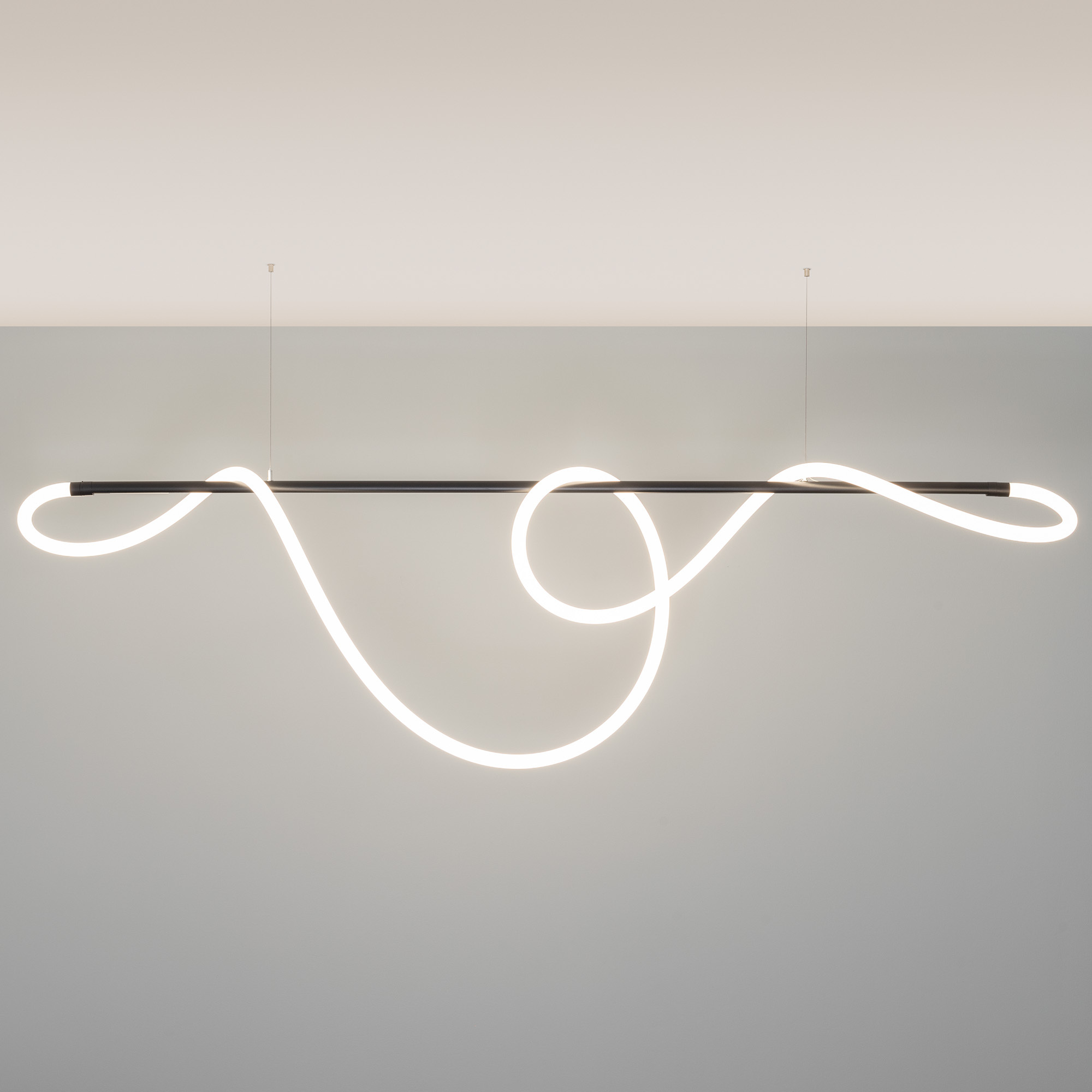 Подвесной светильник. Мощность 70 Вт, св. поток 4700 лм, 67 лм/Вт, дневной 4000 K, CRI>90, угол 360°, напряжение питания 230 В (в комплекте блок питания 230В/48В). Матовый белый фигурный корпус из силикона. Размер: диаметр 30 мм, длина 5000 мм. Монтаж на магнитный трек FLEX. Комплектующие: 021181(1) -1шт, 034063 - 2шт, 034062 - 1шт, 035391 - 1шт, 035385 - 1шт, 035388 - 1шт, коробка 035707.