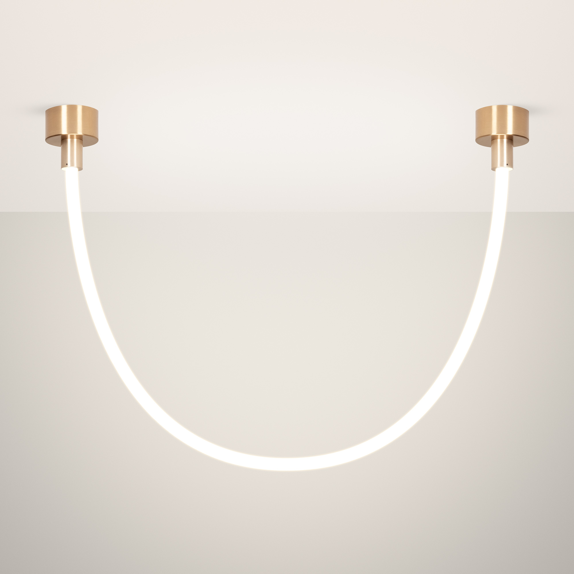 Подвесной светильник. Мощность 18 Вт, св. поток 1160 лм, 64 лм/Вт, дневной 4000 K, CRI>90, угол 360°, напряжение питания 230 В. Золотой круглый корпус из стали, силиконовая герметичная лента, степень защиты IP20. Размер: общая высота чаши 85 мм, высота чаши без вывода под неон 50 мм, диаметр вывода под неон 35 мм, диаметр чаши 130 мм, диаметр силиконовой герметичной ленты 18 мм, длина силиконовой герметичной ленты 1200 мм. Монтаж накладной. Блок питания 24 В, 750 мА, пульсация <5%.