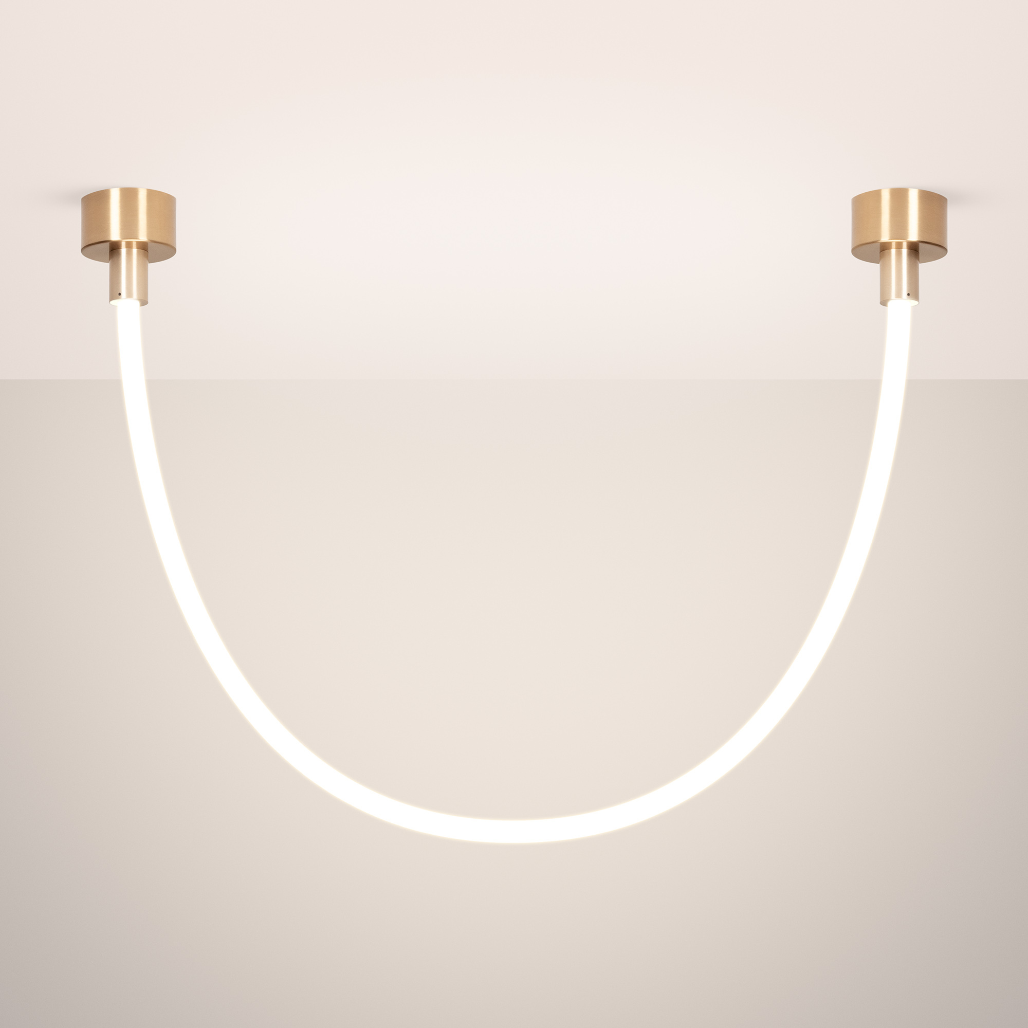 Подвесной светильник. Мощность 18 Вт, св. поток 980 лм, 54 лм/Вт, тёплый 3000 K, CRI>90, угол 360°, напряжение питания 230 В. Золотой круглый корпус из стали, силиконовая герметичная лента, степень защиты IP20. Размер: общая высота чаши 85 мм, высота чаши без вывода под неон 50 мм, диаметр вывода под неон 35 мм, диаметр чаши 130 мм, диаметр силиконовой герметичной ленты 18 мм, длина силиконовой герметичной ленты 1200 мм. Монтаж накладной. Блок питания 24 В, 750 мА, пульсация <5%.
