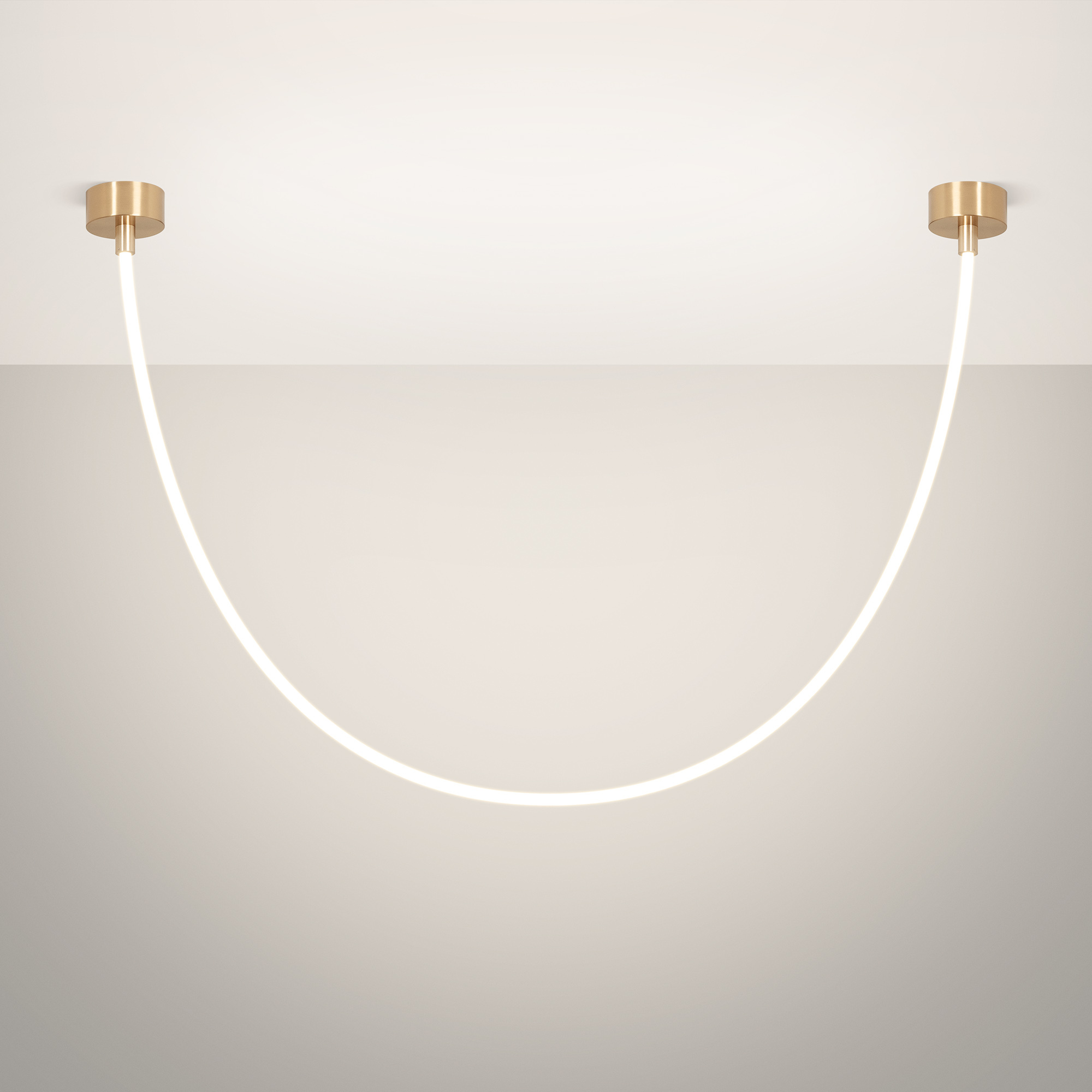 Подвесной светильник. Мощность 36 Вт, св. поток 2300 лм, 63 лм/Вт, дневной 4000 K, CRI>90, угол 360°, напряжение питания 230 В. Золотой круглый корпус из стали, силиконовая герметичная лента, степень защиты IP20. Размер: общая высота чаши 85 мм, высота чаши без вывода под неон 50 мм, диаметр вывода под неон 35 мм, диаметр чаши 130 мм, диаметр силиконовой герметичной ленты 18 мм, длина силиконовой герметичной ленты 2500 мм. Монтаж накладной. Блок питания 24 В, 1880 А, пульсация <5%.