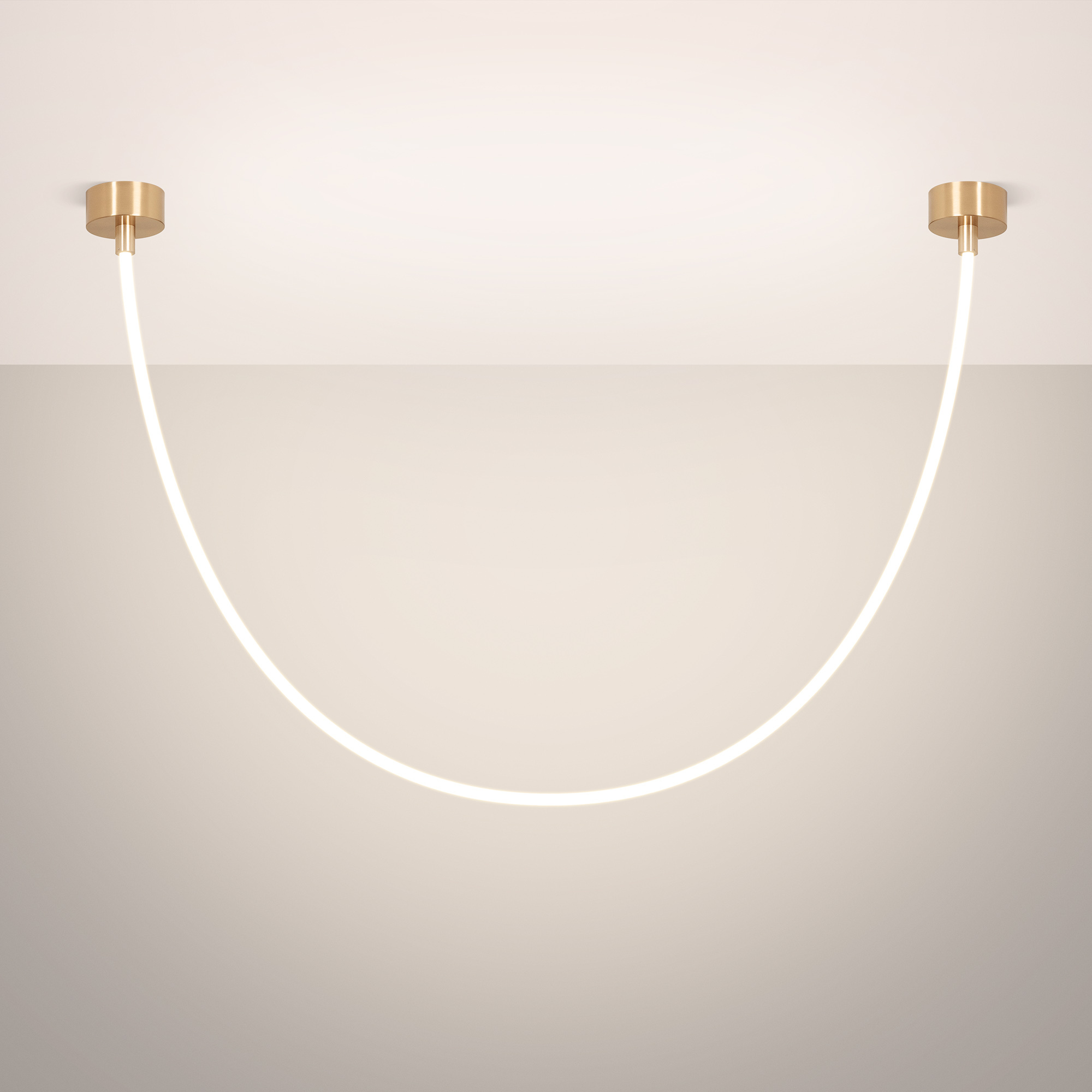 Подвесной светильник. Мощность 36 Вт, св. поток 2080 лм, 57 лм/Вт, тёплый 3000 K, CRI>90, угол 360°, напряжение питания 230 В. Золотой круглый корпус из стали, силиконовая герметичная лента, степень защиты IP20. Размер: общая высота чаши 85 мм, высота чаши без вывода под неон 50 мм, диаметр вывода под неон 35 мм, диаметр чаши 130 мм, диаметр силиконовой герметичной ленты 18 мм, длина силиконовой герметичной ленты 2500 мм. Монтаж накладной. Блок питания 24 В, 1880 мА, пульсация <5%.