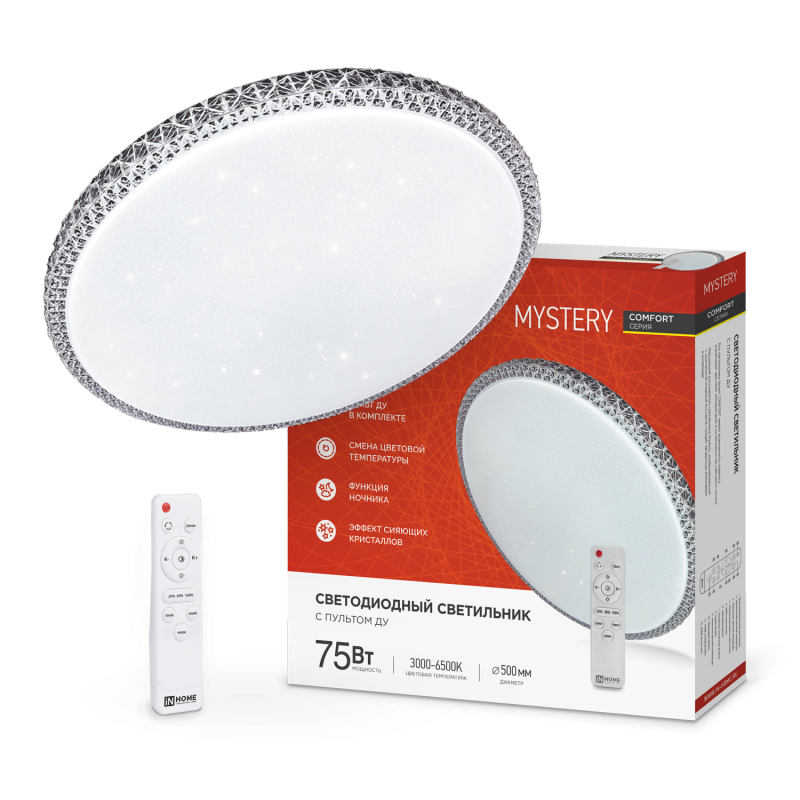 Светодиодный светильник MYSTERY от ТМ INhome в ореоле ограненного «хрусталя» создаст впечатляющий эффект «звездного неба» даже в самом простом помещении, а современная система дистанционного управления повысит уровень домашнего комфорта. Ведь благодаря входящему в комплект пульту, вы сможете регулировать освещение, не вставая с дивана. Красивый, удобный и экономичный светильник излучает равномерный, комфортный для глаз свет, без пульсаций. Пульт дистанционного управления позволяет изменять цветовую температуру от уютного теплого до холодного белого света или приглушить яркость освещения до режима ночника. Холодный дневной свет (6500К) создает яркое контрастное освещение, удобное для работы с мелкими предметами и деталями. Теплый свет 3000К придаст интерьеру уюта и будет способствовать расслаблению в период вечернего отдыха. Умный светильник оснащен специальным таймером выключения на 30 минут и 1 час. Степень защиты IP40 оберегает внутреннее устройство светильника от частиц пыли. Осветительный прибор имеет встроенный дайвер и не нуждается в дополнительном обслуживании. Нормативный срок службы – 30 000 часов работы. Гарантия – 2 года. Применение Данные светильники разработаны для основного освещения бытовых и общественных помещений. Они будут отлично смотреться не только в квартирах и коттеджах (гостиные, спальни, коридоры, холлы, обеденные зоны, детские комнаты), но и в гостиницах, отелях, офисах и магазинах. Благодаря мощным светодиодам последнего поколения, светильник создает оптимальный уровень освещения во внутреннем пространстве. Преимущества • Низкое энергопотребление • Максимальная светоотдача • Оптимальное рассеивание светового потока • Устойчивый к выгоранию ПВХ-рассеиватель • Корпус из прочного негорючего пластика • Не содержит вредных веществ (ртуть, свинец и др.) • Защита по стандарту IP40 • Функция ночника • Пульт управления в комплекте