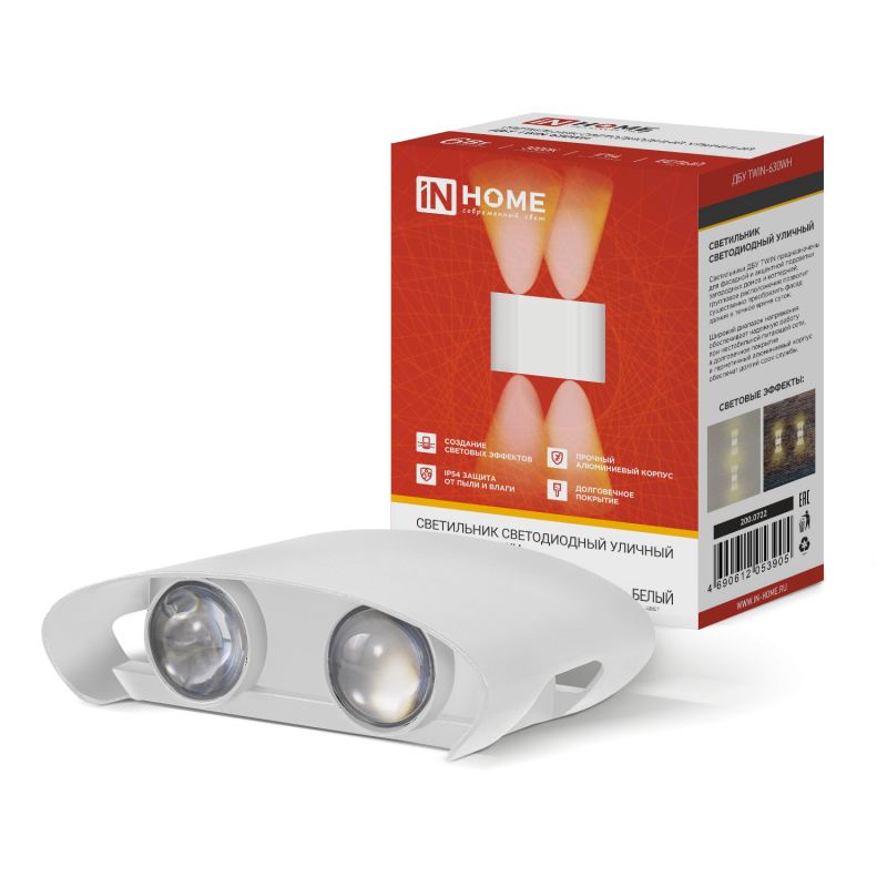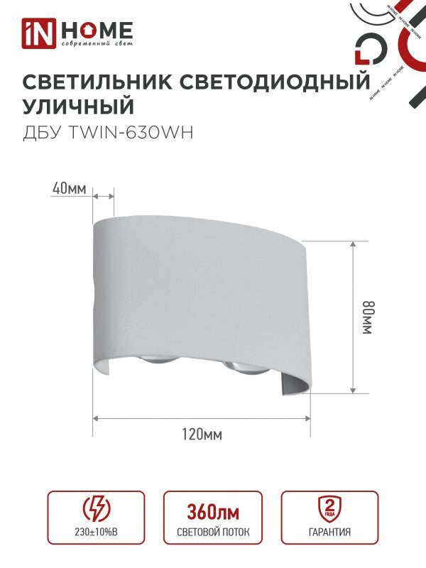 Светильник светодиодный ДБУ TWIN-6W 6Вт 3000К IP54 уличный бел. IN HOME 4690612053905