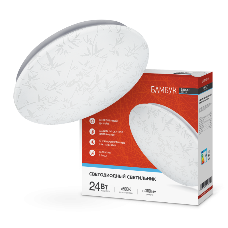 Светодиодный светильник БАМБУК серии DECO от ТМ In Home в светлом матовом корпусе украшен принтом в виде стилизованных листьев бамбука. Согласно древнему китайскому учению фен-шуй, изображение этого растения приносит в дом удачу, счастье и процветание. Линейка светильников БАМБУК представлена в диапазоне мощностей от 12 Вт до 48 Вт, что позволяют подобрать оптимальный осветительный прибор, в зависимости от конфигурации и габаритов помещения. Светодиодные светильники БАМБУК серии DECO предназначены для внутреннего освещения жилых помещений, подъездов и сферы ЖКХ, офисных и административных учреждений, магазинов, а также холлов, коридоров, лестничных пролётов, подсобок и других помещений вспомогательного назначения. Современные светильники серии DECO, работающие на основе последнего поколения светодиодов, обеспечивают яркий равномерный световой поток при максимальной экономии электроэнергии. Отсутствие пульсации гарантирует сохранность здоровья глаз. Светодиодные светильники являются одним из самых экологически безвредных источников света и не требуют специальной утилизации и переработки. Светильники получили сертификат таможенного союза EAC.