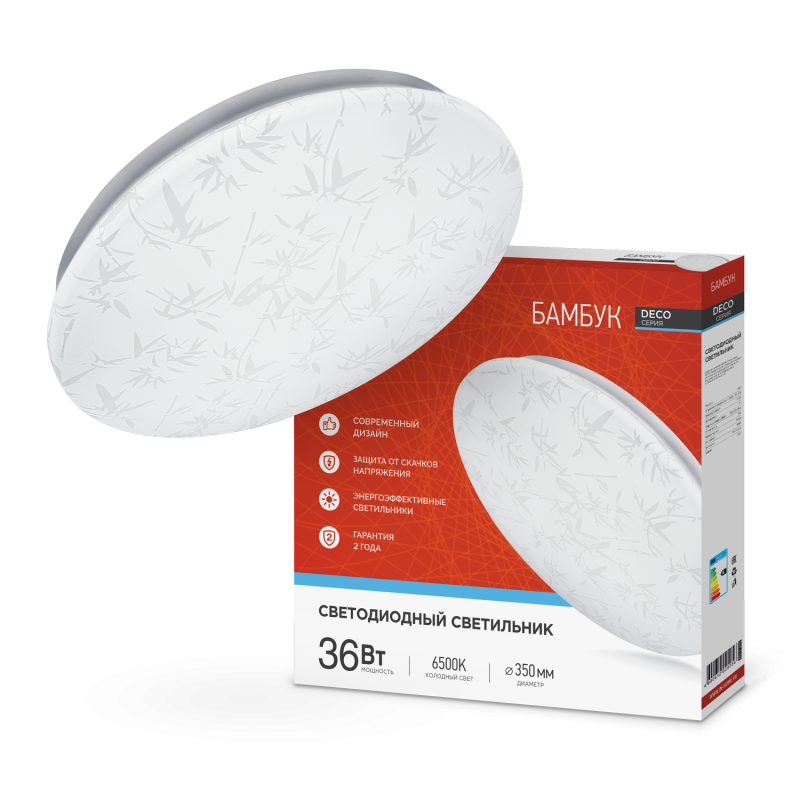 Светодиодный светильник БАМБУК серии DECO от ТМ In Home в светлом матовом корпусе украшен принтом в виде стилизованных листьев бамбука. Согласно древнему китайскому учению фен-шуй, изображение этого растения приносит в дом удачу, счастье и процветание. Линейка светильников БАМБУК представлена в трех размерах от 190 до 350 мм. Несколько вариаций мощности (в диапазоне от 12 Вт до 36 Вт) позволяют подобрать оптимальный осветительный прибор, в зависимости от конфигурации и габаритов помещения. Применение Светодиодные светильники БАМБУК серии DECO предназначены для внутреннего освещения жилых помещений, подъездов и сферы ЖКХ, офисных и административных учреждений, магазинов, а также холлов, коридоров, лестничных пролётов, подсобок и других помещений вспомогательного назначения. Преимущества Современные светильники серии DECO, работающие на основе последнего поколения светодиодов, обеспечивают яркий равномерный световой поток при максимальной экономии электроэнергии. Отсутствие пульсации гарантирует сохранность здоровья глаз. Светодиодные светильники являются одним из самых экологически безвредных источников света и не требуют специальной утилизации и переработки. Светильники получили сертификат таможенного союза EAC. Производятся по ГОСТу Р МЭК 60598-1-2011. Монтаж Светодиодные светильники серии DECO применяются для работы в сетях переменного тока напряжением 230В ± 10% с частотой 50 герц. Перед установкой следует убедиться в правильности напряжения питающей сети и наличии защитного устройства в цепи (автоматический выключатель, предохранитель). Этапы установки: отключите сетевое напряжение, извлеките светильник из упаковки, открутите плафон светильника, повернув его по часовой стрелке. Через клеммную колодку подключите подготовленные концы проводов осветительного прибора к проводу сети. Установите светильник на поверхности и зафиксируйте при помощи дюбелей и саморезов. Сборку светильника следует осуществлять в обратной последовательности.