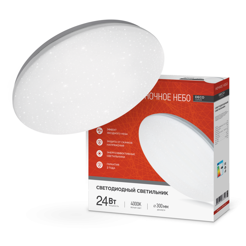 Лаконичность форм и простота линий светильника НОЧНОЕ НЕБО ТМ INhome с эффектом «звездного неба» на поверхности рассеивателя понравятся любителям классических и современных интерьеров. Линейка светильников НОЧНОЕ НЕБО серии DECO представлена в трех размерах от 190 до 350 мм. Несколько вариаций мощности (в диапазоне от 12 Вт до 36 Вт) позволяют подобрать оптимальный осветительный прибор в зависимости от конфигурации и габаритов помещения. Применение Светодиодные светильники НОЧНОЕ НЕБО серии DECO подойдет для освещения домашних интерьеров, отелей, офисных и административных зданий, торговых залов, сферы ЖКХ и др., а также холлов, коридоров, лестничных пролётов, подсобок и других помещений вспомогательного назначения. Преимущества Современные светильники серии DECO, работающие на основе последнего поколения светодиодов, обеспечивают яркий равномерный световой поток при максимальной экономии электроэнергии. Отсутствие пульсации гарантирует сохранность здоровья глаз. Светодиодные светильники являются одним из самых экологически безвредных источников света и не требуют специальной утилизации и переработки. Светильники получили сертификат таможенного союза EAC. Производятся по ГОСТу Р МЭК 60598-1-2011. Монтаж Светодиодные светильники серии DECO применяются для работы в сетях переменного тока напряжением 230В ± 10% с частотой 50 герц. Перед установкой следует убедиться в правильности напряжения питающей сети и наличии защитного устройства в цепи (автоматический выключатель, предохранитель). Этапы установки: отключите сетевое напряжение, извлеките светильник из упаковки, открутите плафон светильника, повернув его по часовой стрелке. Через клеммную колодку подключите подготовленные концы проводов осветительного прибора к проводу сети. Установите светильник на поверхности и зафиксируйте при помощи дюбелей и саморезов. Сборку светильника следует осуществлять в обратной последовательности.