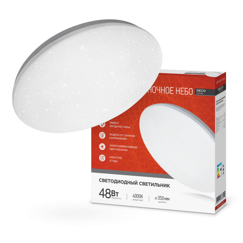 Лаконичность форм и простота линий светильника НОЧНОЕ НЕБО от ТМ In Home с эффектом «звездного неба» на поверхности рассеивателя понравятся любителям классических и современных интерьеров. При минимальных затратах электроэнергии светильник обеспечивает яркий, но комфортный для глаз свет и гарантирует отсутствие пульсации. Разнообразие модификаций поможет создать оптимальный вариант интерьерного освещения. Линейка светильников НОЧНОЕ НЕБО DECO In Home представлена в нескольких вариантах размеров и мощностей (от 12 Вт до 48 Вт), что позволяет подобрать оптимальный осветительный прибор, в зависимости от конфигурации и габаритов помещения.