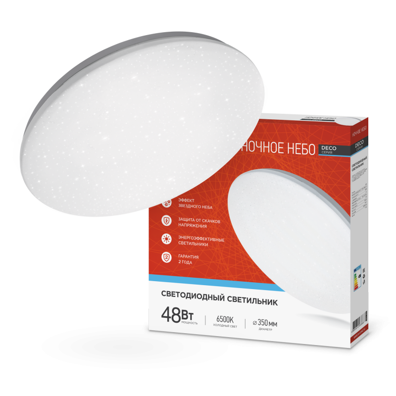 Лаконичность форм и простота линий светильника НОЧНОЕ НЕБО ТМ In Home с эффектом «звездного неба» на поверхности рассеивателя понравятся любителям классических и современных интерьеров. Светодиодные светильники НОЧНОЕ НЕБО серии DECO предназначены для внутреннего освещения жилых помещений, подъездов и сферы ЖКХ, офисных и административных учреждений, магазинов, а также холлов, коридоров, лестничных пролётов, подсобок и других помещений вспомогательного назначения. Современные светильники серии DECO, работающие на основе последнего поколения светодиодов, обеспечивают яркий равномерный световой поток при максимальной экономии электроэнергии. Отсутствие пульсации гарантирует сохранность здоровья глаз. Светодиодные светильники являются одним из самых экологически безвредных источников света и не требуют специальной утилизации и переработки. Линейка светильников представлена в нескольких размерах и вариантах мощностей (от 12 Вт до 48 Вт), что позволяет подобрать оптимальный осветительный прибор в зависимости от конфигурации и габаритов помещения.