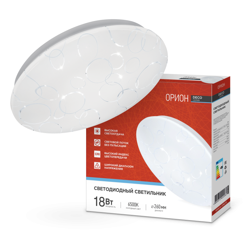 Светодиодный светильник круглой формы ОРИОН серии DECO от ТМ In Home в классическом белом корпусе с нейтральным абстрактным рисунком удачно впишется в любой современный интерьер. Линейка светильников ОРИОН представлена в трех размерах от 190 до 350 мм. Несколько вариаций мощности (в диапазоне от 12 Вт до 36 Вт) позволяют подобрать оптимальный осветительный прибор, в зависимости от конфигурации и габаритов помещения. Применение Светодиодные светильники ОРИОН серии DECO предназначены для внутреннего освещения жилых помещений, подъездов и сферы ЖКХ, офисных и административных учреждений, магазинов, а также холлов, коридоров, лестничных пролётов, подсобок и других помещений вспомогательного назначения. Преимущества Современные светильники серии DECO, работающие на основе последнего поколения светодиодов, обеспечивают яркий равномерный световой поток при максимальной экономии электроэнергии. Отсутствие пульсации гарантирует сохранность здоровья глаз. Светодиодные светильники являются одним из самых экологически безвредных источников света и не требуют специальной утилизации и переработки. Светильники получили сертификат таможенного союза EAC. Производятся по ГОСТу Р МЭК 60598-1-2011. Монтаж Светодиодные светильники серии DECO применяются для работы в сетях переменного тока напряжением 230В ± 10% с частотой 50 герц. Перед установкой следует убедиться в правильности напряжения питающей сети и наличии защитного устройства в цепи (автоматический выключатель, предохранитель). Этапы установки: отключите сетевое напряжение, извлеките светильник из упаковки, открутите плафон светильника, повернув его по часовой стрелке. Через клеммную колодку подключите подготовленные концы проводов осветительного прибора к проводу сети. Установите светильник на поверхности и зафиксируйте при помощи дюбелей и саморезов. Сборку светильника следует осуществлять в обратной последовательности.