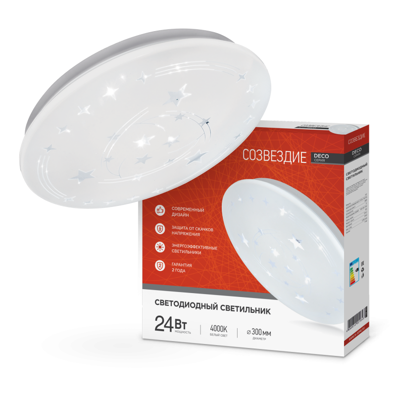 Светодиодный светильник серии DECO от компании In Home с динамичным рисунком в виде хоровода созвездий станет удачным дополнением жилого интерьера. Линейка светильников СОЗВЕЗДИЕ представлена в диапазоне мощностей от 12 Вт до 48 Вт, что позволяют подобрать оптимальный осветительный прибор, в зависимости от конфигурации и габаритов помещения. Светодиодные светильники СОЗВЕЗДИЕ серии DECO предназначены для внутреннего освещения жилых помещений, подъездов и сферы ЖКХ, офисных и административных учреждений, магазинов, а также холлов, коридоров, лестничных пролётов, подсобок и других помещений вспомогательного назначения. Современные светильники серии DECO, работающие на основе последнего поколения светодиодов, обеспечивают яркий равномерный световой поток при максимальной экономии электроэнергии. Отсутствие пульсации гарантирует сохранность здоровья глаз. Светодиодные светильники являются одним из самых экологически безвредных источников света и не требуют специальной утилизации и переработки.