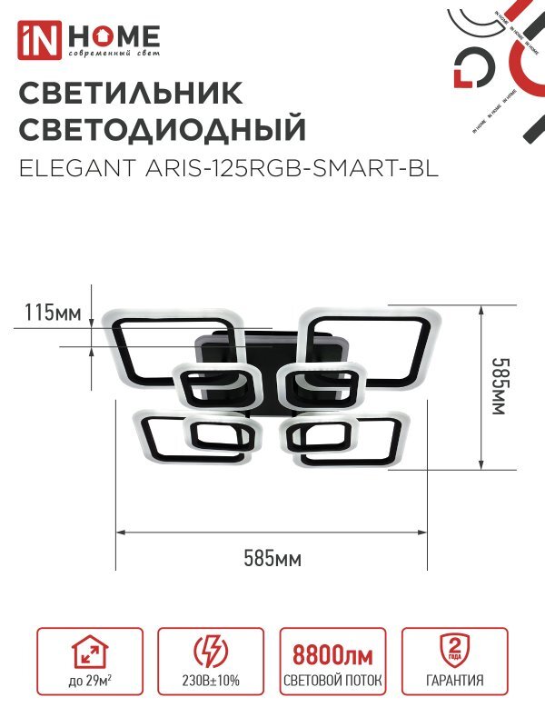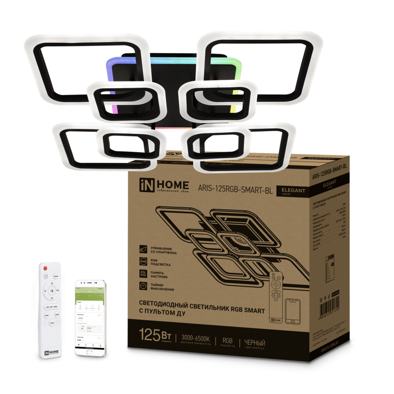 Светильник светодиодный ELEGANT ARIS-125RGB-SMART-BL 125Вт 3000-6500К 8800лм 230В 585х585х115мм ПУ черн. IN HOME 4690612051314
