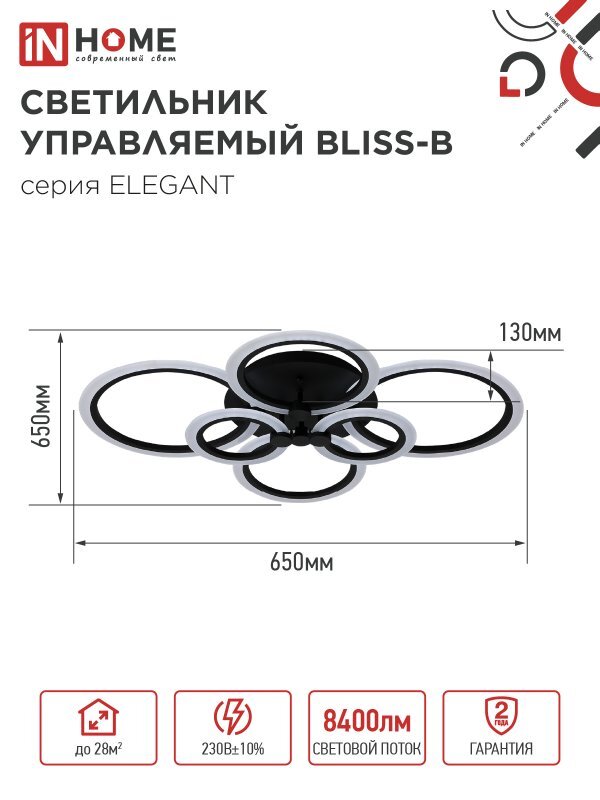 Футуристичный дизайн контурного плафона светильника ELEGANT BLISS от ТМ INhome украсит любой современный интерьер. Пульт дистанционного управления обеспечит новый уровень домашнего комфорта, с его помощью вы можете плавно отрегулировать яркость (снизить до энергосберегающего режима) и цветовую температуру (выбрать «теплый» 3000К, «дневной» 4500К или «холодный» 6500К). Также доступны следующие функции: • Ночное освещение (5% от полной мощности) • Таймер отложенного выключения (30 мин) • Функция запоминания предпочтительного режима освещения Светильник излучает равномерный, комфортный для глаз свет без пульсаций во всем диапазоне питания. Предусмотрена возможность управления двумя светильниками с помощью одного пульта. Степень защиты IP40 оберегает светильник от проникновения пыли. Монтаж осуществляется накладным способом с помощью шурупов. Номинальный срок службы – 30 000 часов работы. Срок гарантии – 2 года. Линейка представлена в мощностях 90 и 120Вт, и двух вариациях цветового исполнения – белом и черном корпусе.
