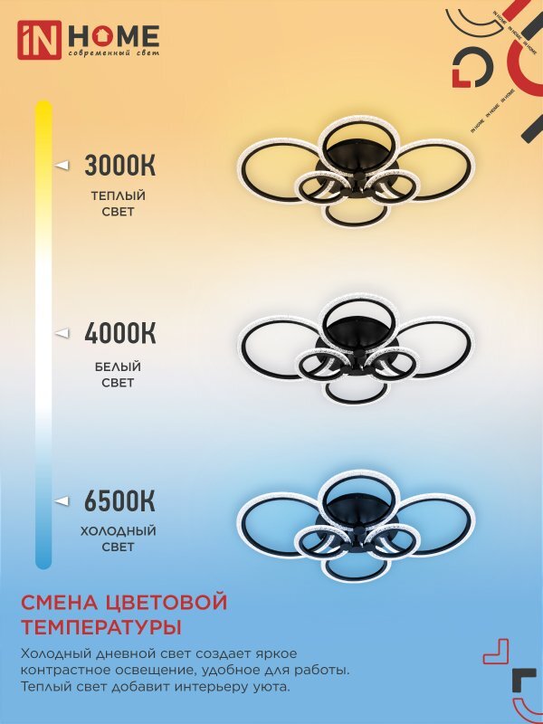 Футуристичный дизайн контурного плафона светильника ELEGANT BLISS ТМ IN HOME украсит любой современный интерьер. Пульт дистанционного управления обеспечит новый уровень домашнего комфорта, с его помощью вы можете плавно отрегулировать яркость (снизить до энергосберегающего режима) и цветовую температуру (выбрать «теплый» 3000К, «дневной» 4500К или «холодный» 6500К). Также доступны следующие функции: • Ночное освещение (5% от полной мощности) • Таймер отложенного выключения (30 мин) • Функция запоминания предпочтительного режима освещения Светильник излучает равномерный, комфортный для глаз свет без пульсаций во всем диапазоне питания. Предусмотрена возможность управления двумя светильниками с помощью одного пульта. Степень защиты IP40 оберегает светильник от проникновения пыли. Монтаж осуществляется накладным способом с помощью шурупов. Номинальный срок службы – 30 000 часов работы. Срок гарантии – 2 года. Линейка представлена в мощностях 90, 120 и 150Вт, и двух вариациях цветового исполнения – белом и черном корпусе.