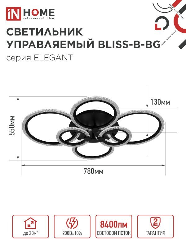 Светильник светодиодный ELEGANT BLISS-B-BG 120Вт 3000-6500К 8400лм 230В 780х550х130мм с пультом ДУ черн. IN HOME 4690612051857