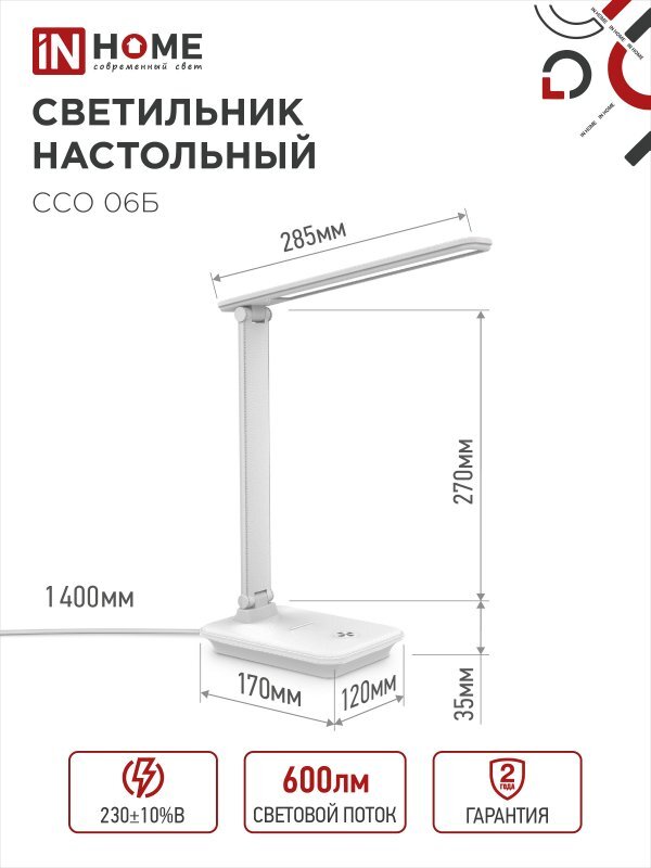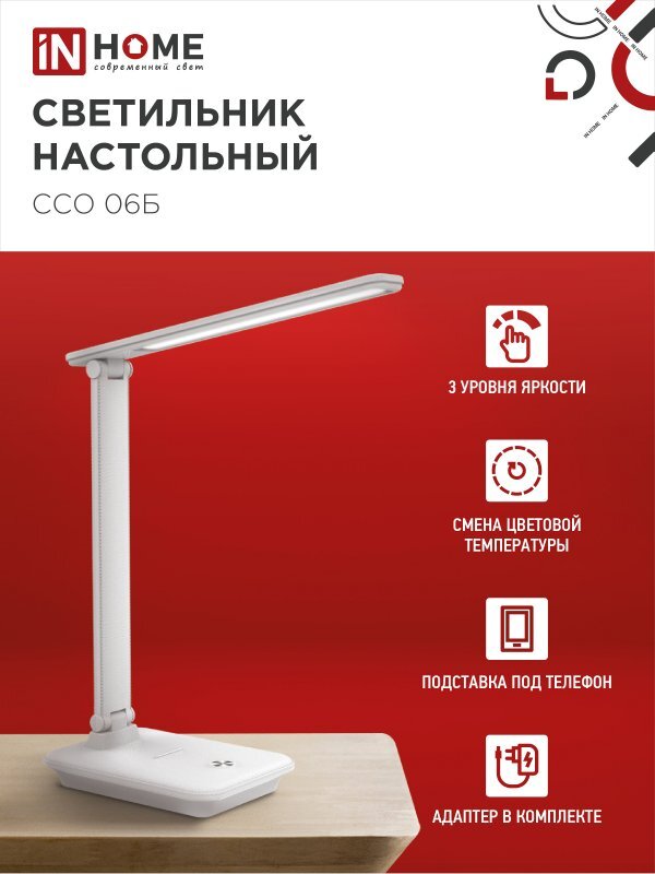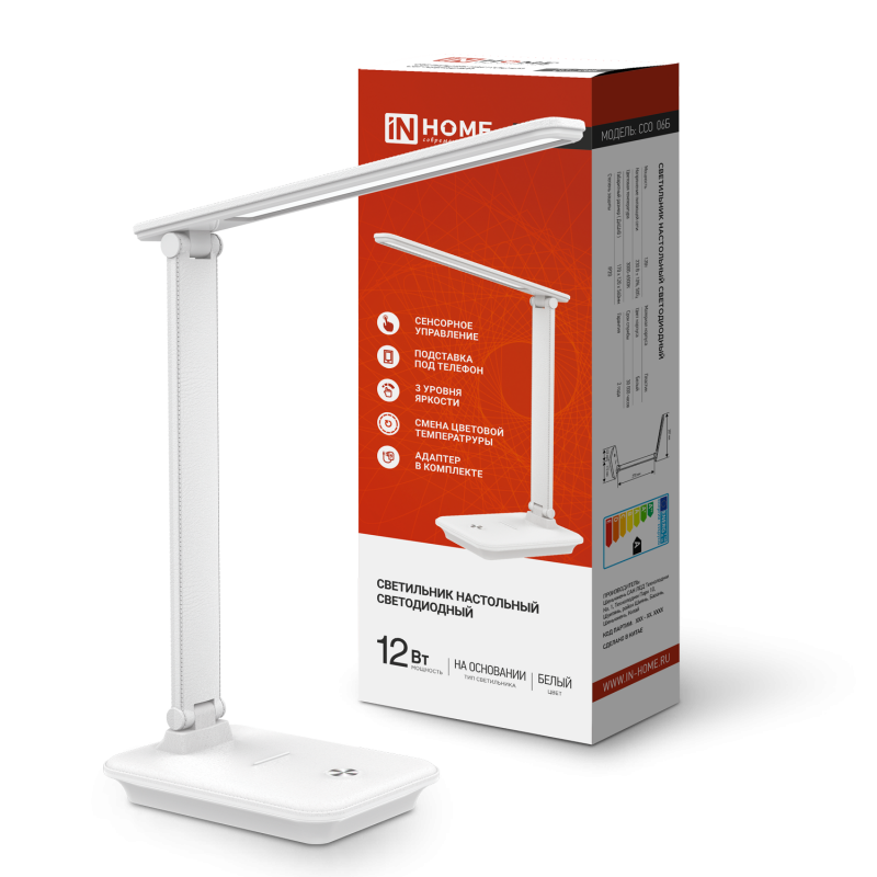 Светильник светодиодный настольный ССО 06Б 12Вт 3000-6500К 600лм сенсор-диммер с подставкой под телефон с адаптером бел. IN HOME 4690612036519
