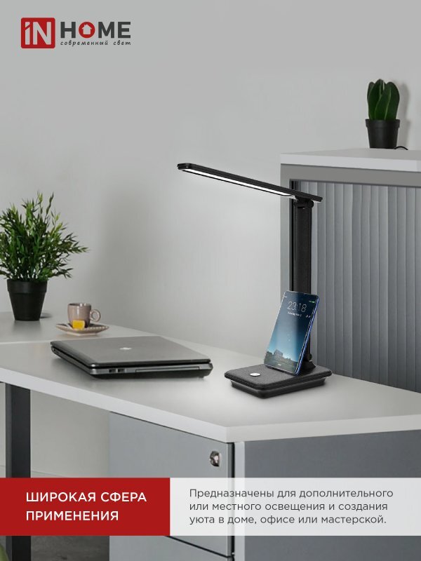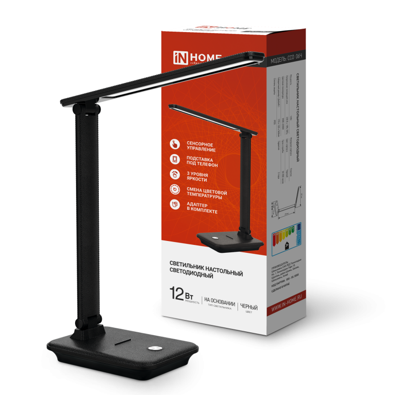 Светильник светодиодный настольный ССО 06Ч 12Вт 3000-6500К 600лм сенсор-диммер с подставкой под телефон с адаптером черн. IN HOME 4690612036526