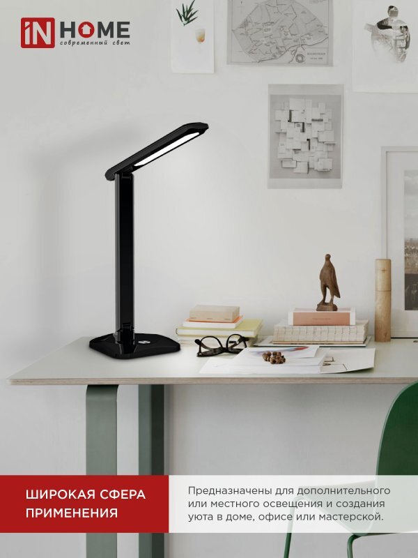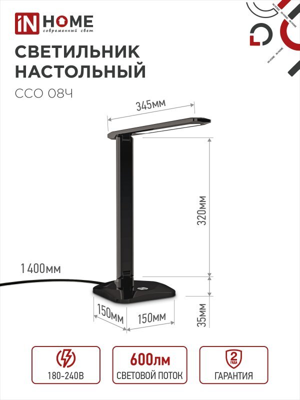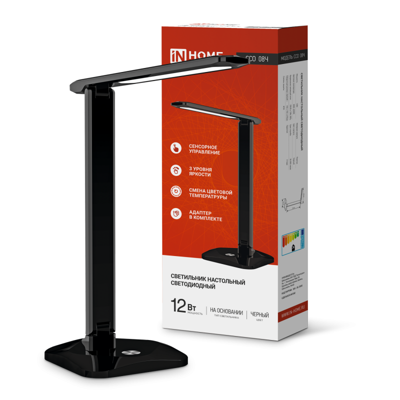 Светильник светодиодный настольный ССО 08Ч 12Вт 3000-6500К 600лм сенсор-диммер с адаптером черн. IN HOME 4690612036564