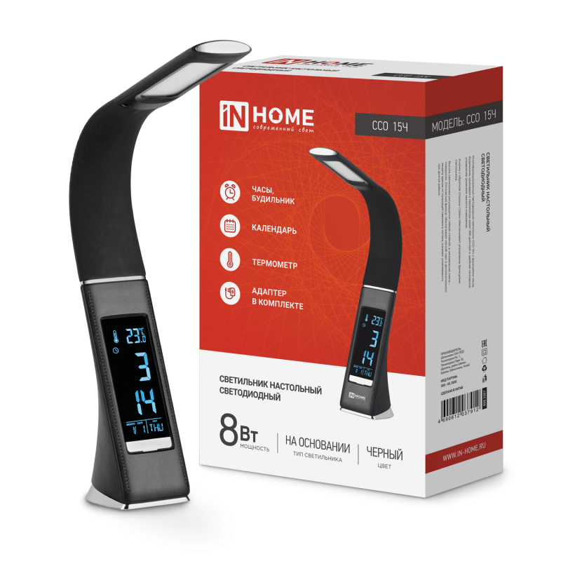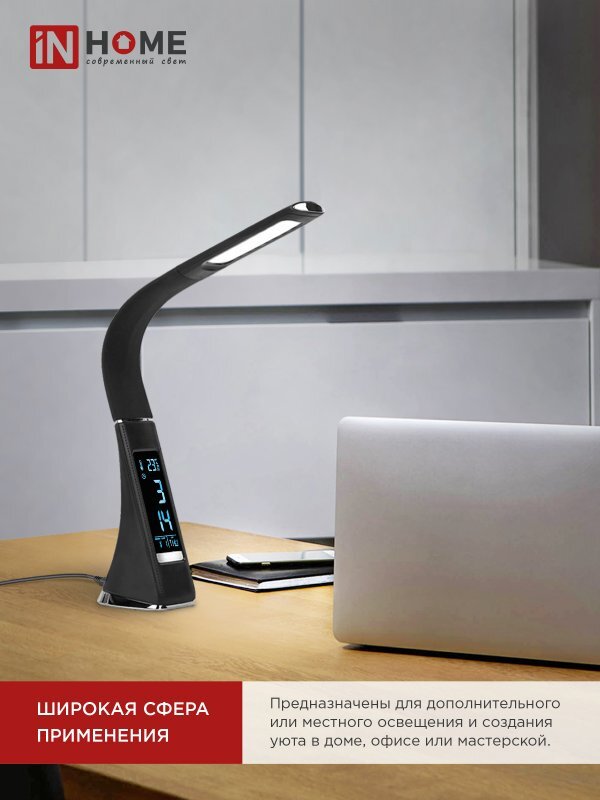 Светильник светодиодный настольный ССО 15Ч 8Вт 6500К 480лм сенсор-диммер часы календар. темпер. с адаптером черн. IN HOME 4690612037912