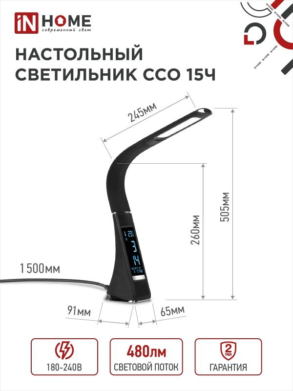 Основное назначение настольного светодиодного светильника ССО 15 от ТМ In Home – дополнительное освещение рабочего стола. Модель подходит как для дома, так и для офиса. Удобное сенсорное управление позволяет регулировать уровень яркости светового потока (три режима мощности). Светильник оснащен дополнительными функциями - часы, будильник, термометр и календарь. Питание светильников ССО-15 осуществляется от бытовой электросети 230В. Адаптер входит в комплект. Светодиодные светильники In Home гарантируют высокую экономичность, экологическую безопасность и комфорт для зрения.