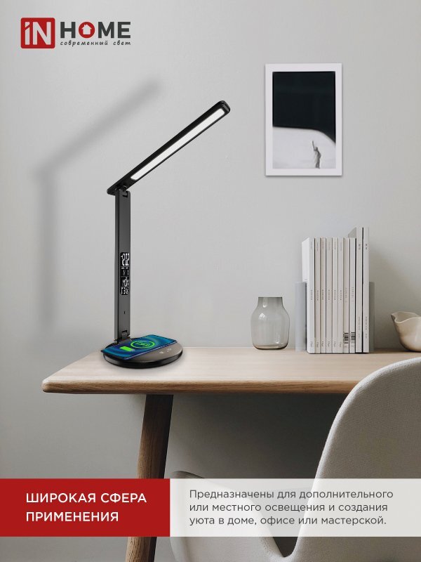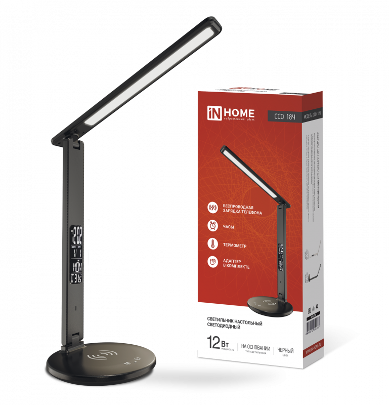 Светильник светодиодный настольный ССО 18Ч 12Вт 3-6.5К 600лм сенсор-диммер часы темп. беспроводн. зарядка с адаптером черн. IN HOME 4690612041087