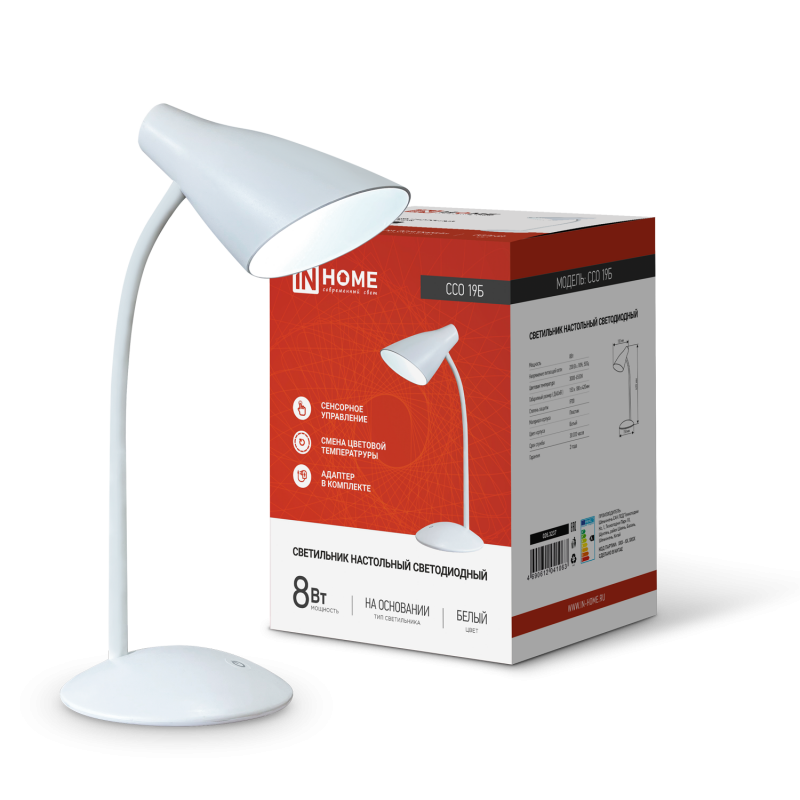 Светильник светодиодный настольный ССО 19Б 8Вт 3000-6500К 480лм сенсор-диммер с адаптером бел. IN HOME 4690612041063