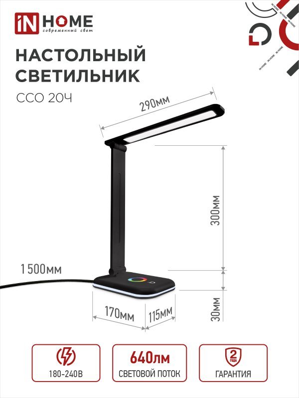 Светильник светодиодный настольный ССО 20Ч 12Вт 6500К 640лм RGB-подсветка сенсор-диммер с адаптером черн. IN HOME 4690612041100