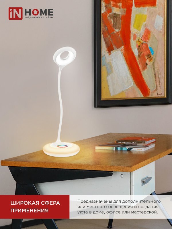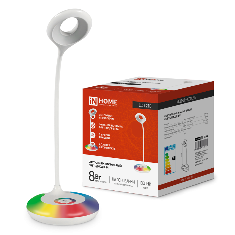 Светильник светодиодный настольный ССО 21Б 8Вт 6500К 640лм RGB-подсветка сенсор-диммер с адаптером бел. IN HOME 4690612037615