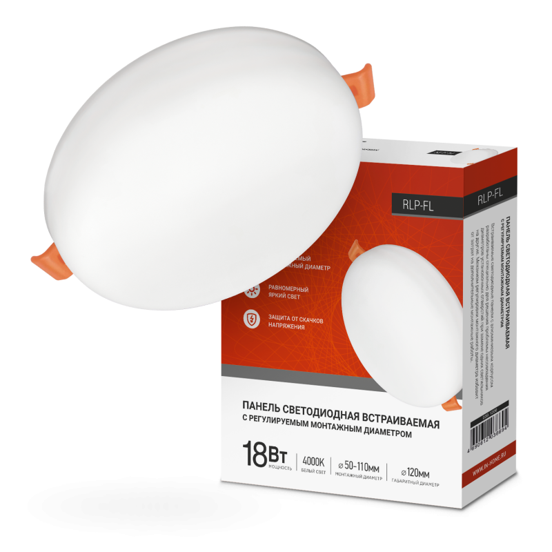 Светильник светодиодный RLP-FL 18Вт 4000К IP20 1620лм 230В 120мм с рег. монтаж. 45-100мм встраив. безрамочн. панель бел. IN HOME 4690612036694