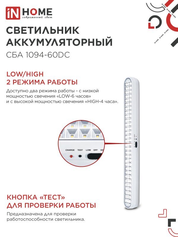 Светильник светодиодный СБА 1094-60DC 60LED 2.2А.ч lithium battery DC аварийный IN HOME 4690612029443
